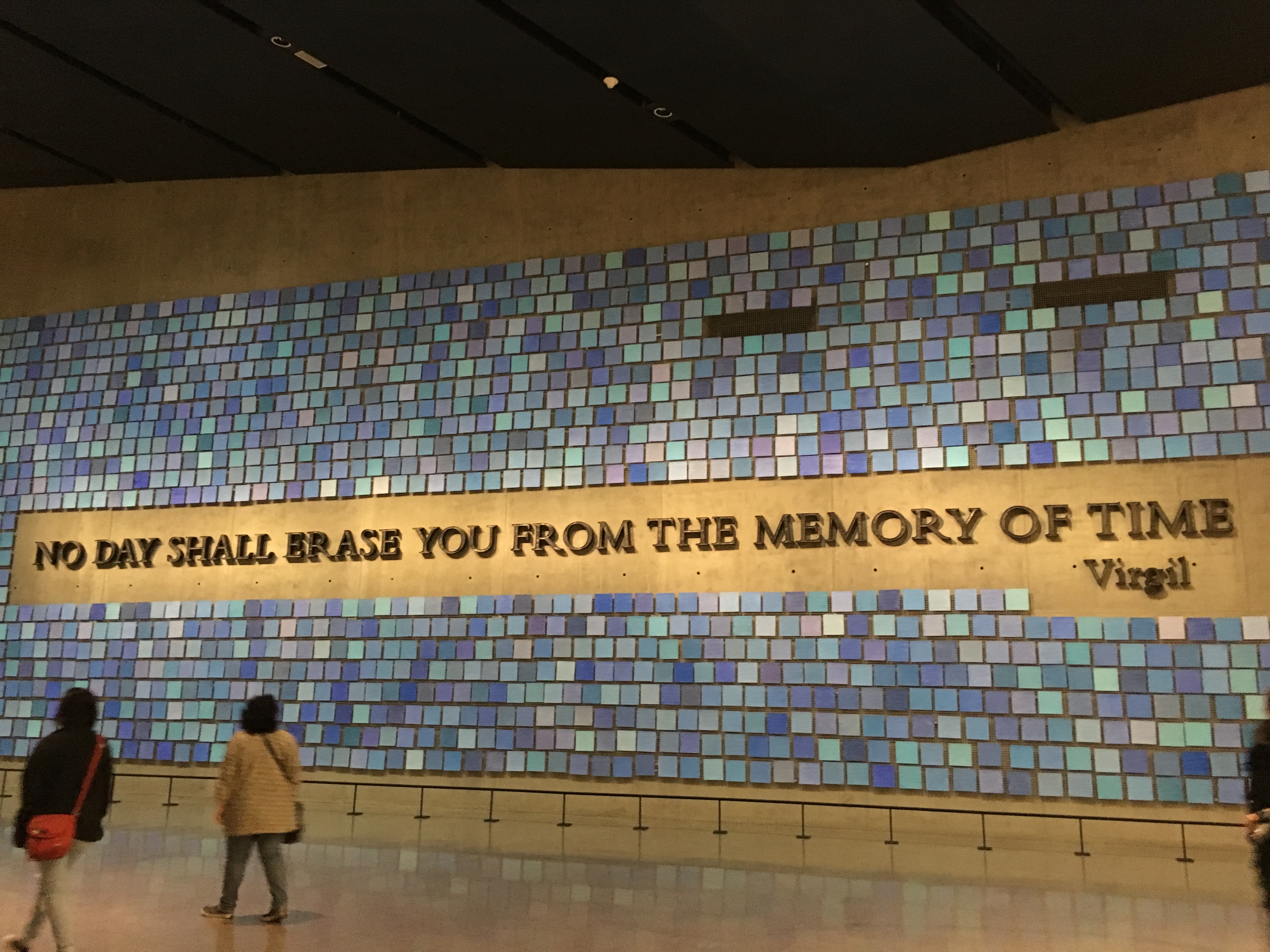 A light-filled atrium area with a security checkpoint greeted us. Multiple glass panes are built around two original tridents that were part of the North Tower facade. Descending the escalators into the main part of the museum, a reverent silence filled the air.