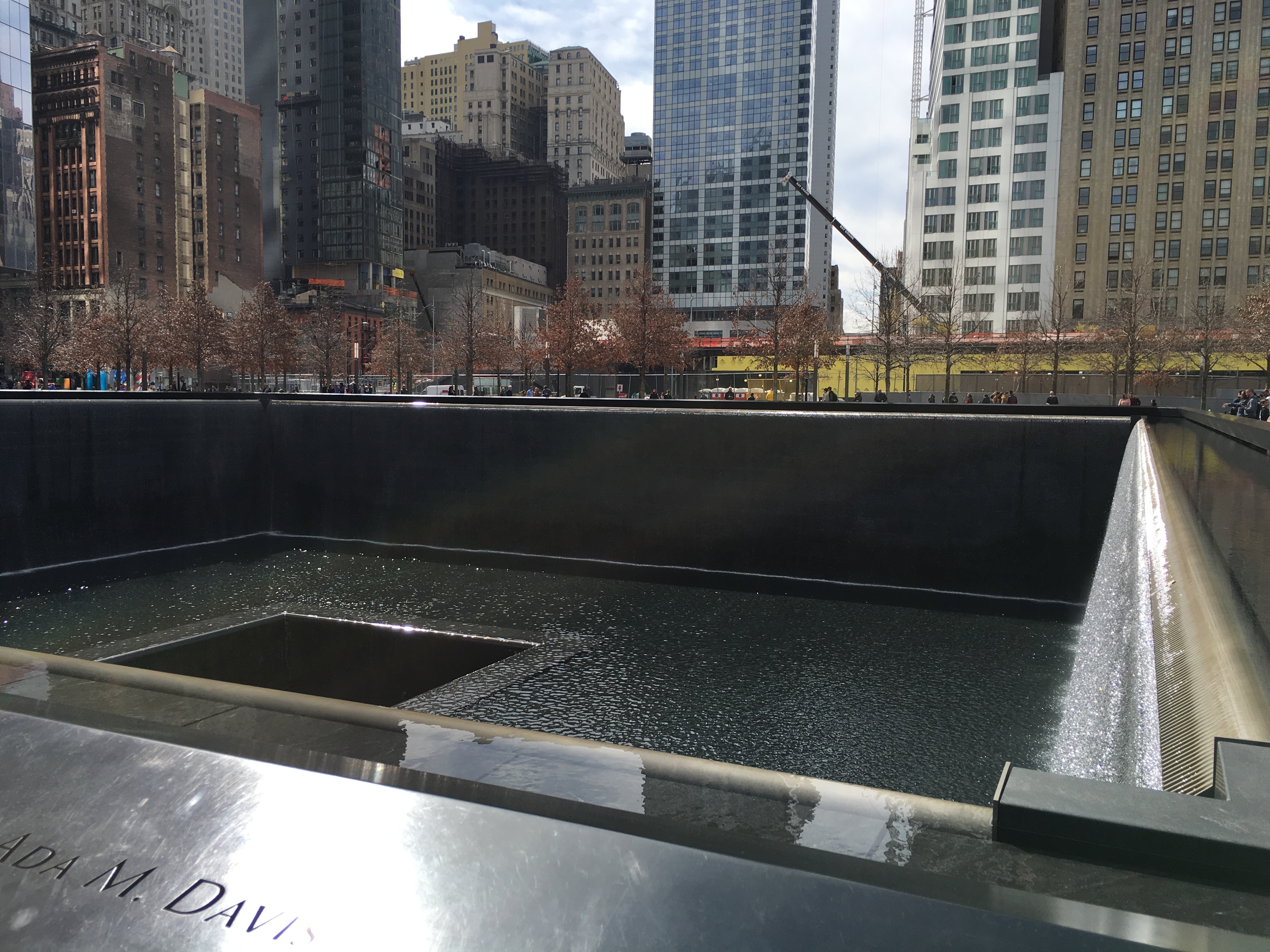 Outside we saw the 8-acre memorial area. Two reflecting pools where the towers once stood are the main attraction. Engraved on the sides are the names of each victim from both attacks. Water pours from the inside walls into the deep center recess. These one-acre each pools are considered to be the largest man-made waterfalls in the U.S.