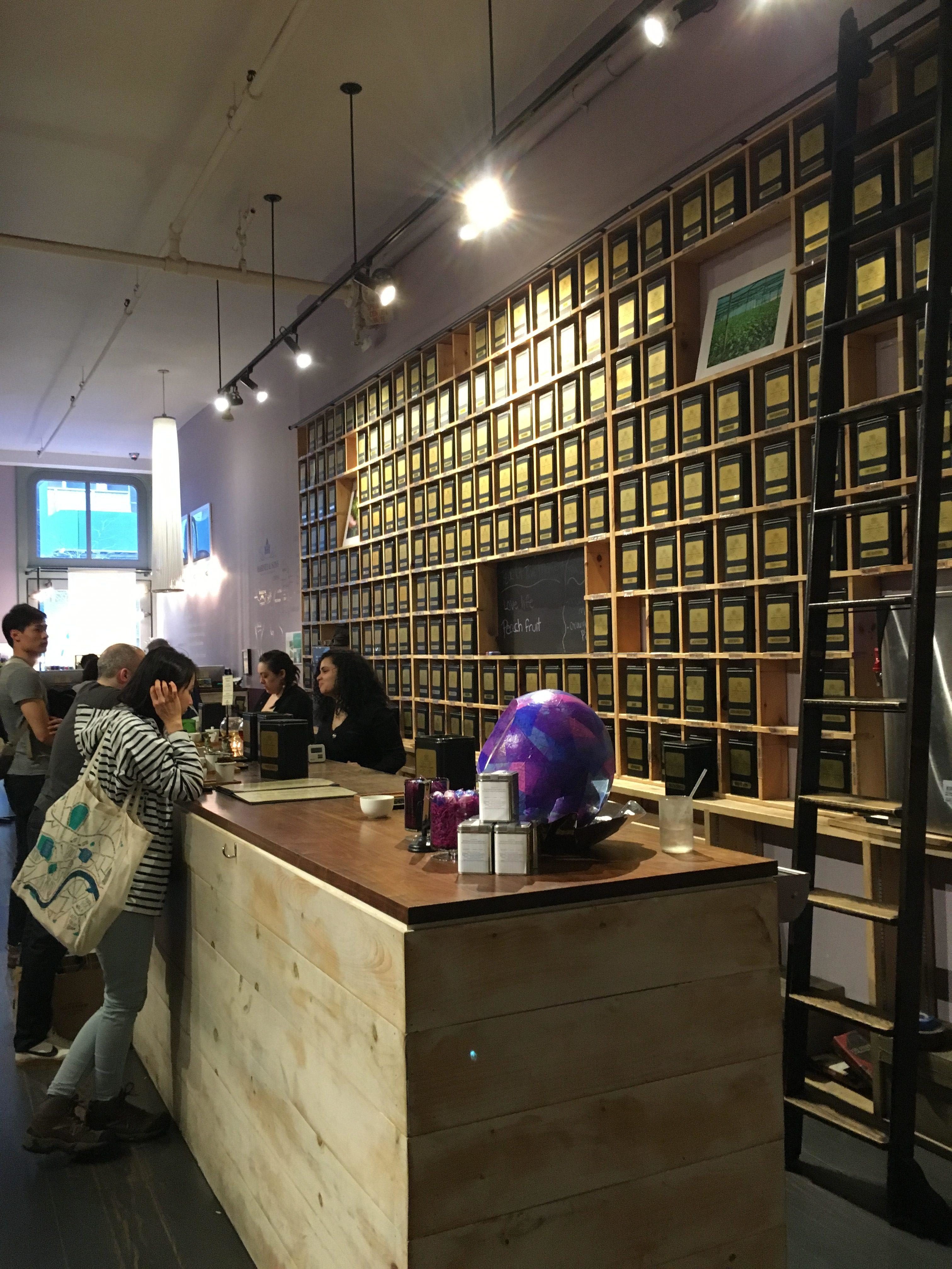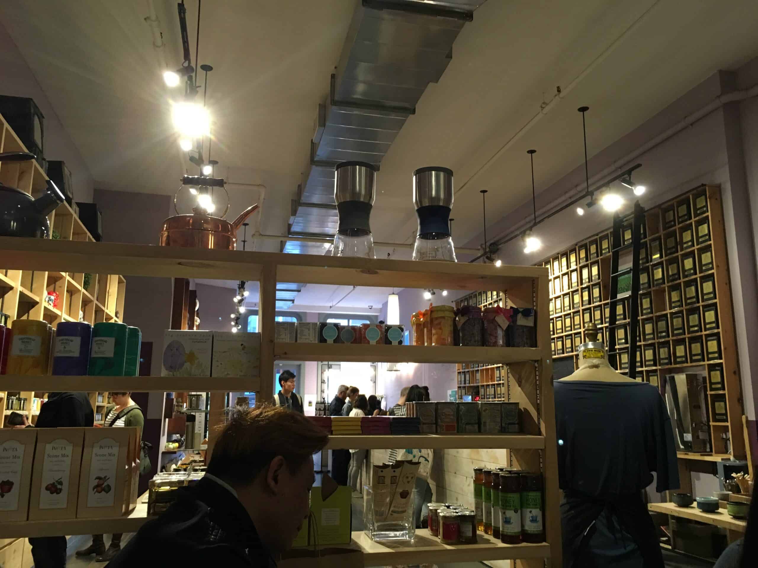 Walls of tea tins flank the long, narrow shop. To the immediate left was a tasting area.