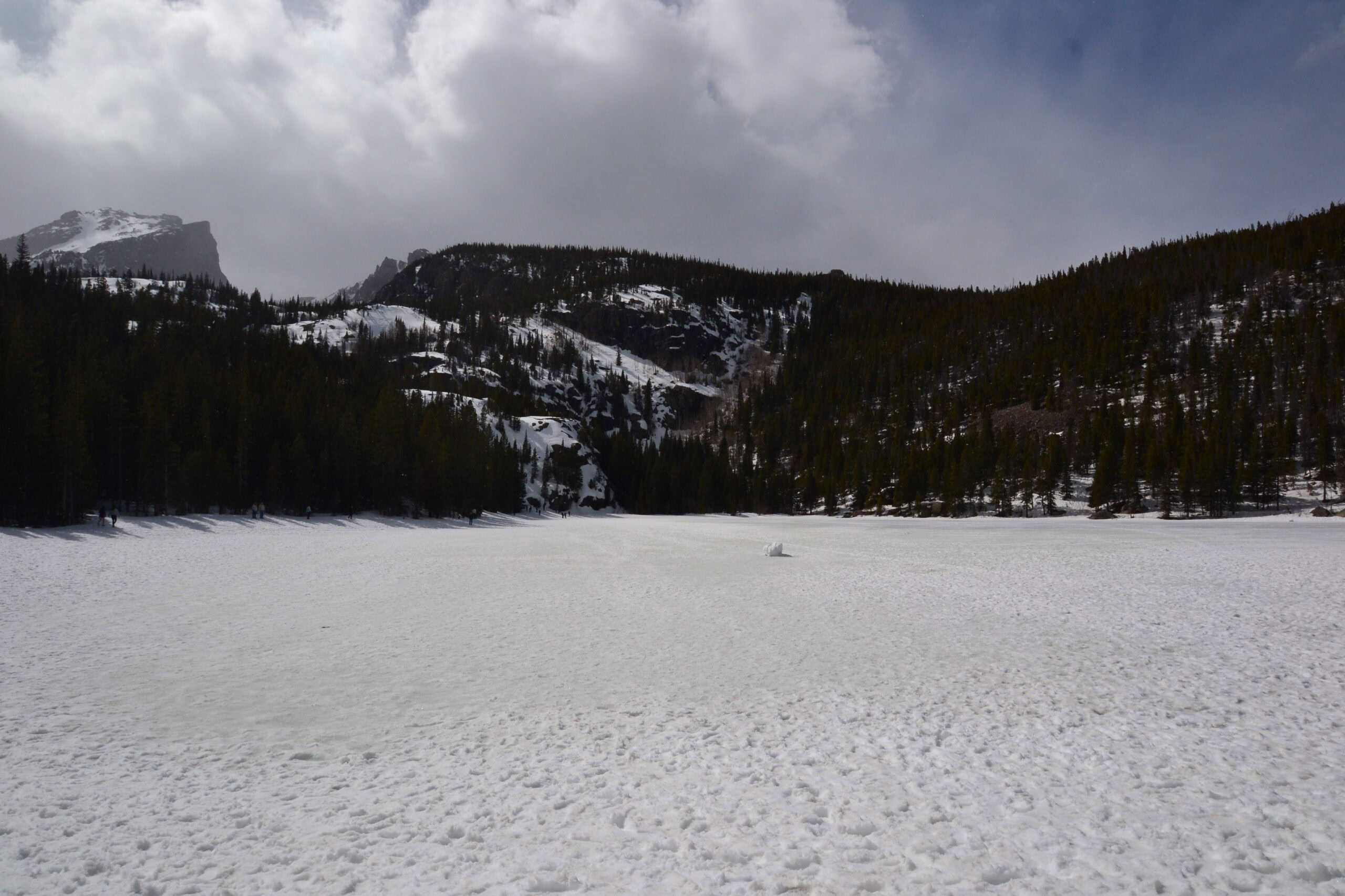 We headed straight to Bear Lake. Although the trail had four feet of snow, it was packed enough to walk on it without snow shoes. The lake was completely frozen, but not safe enough to walk over.