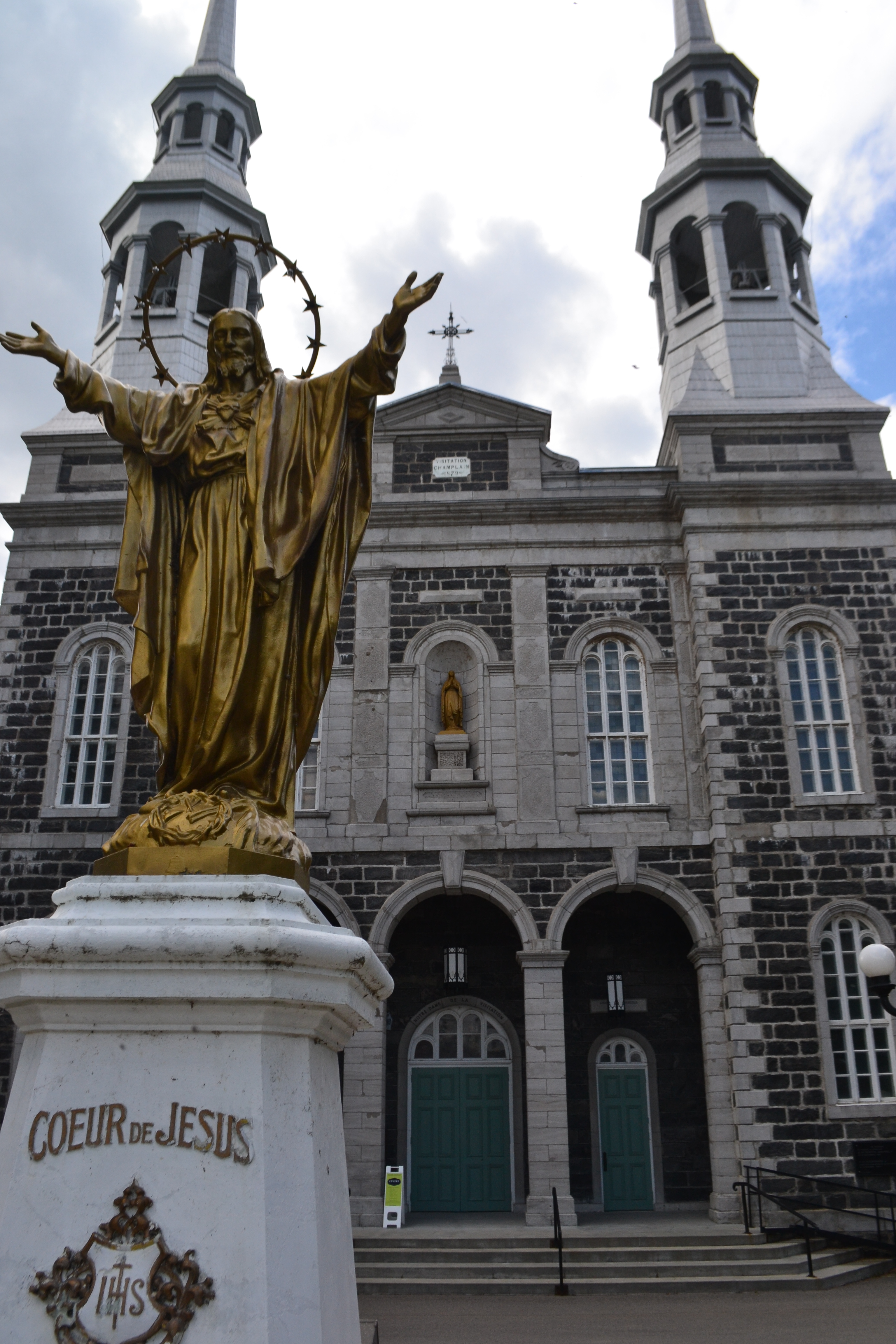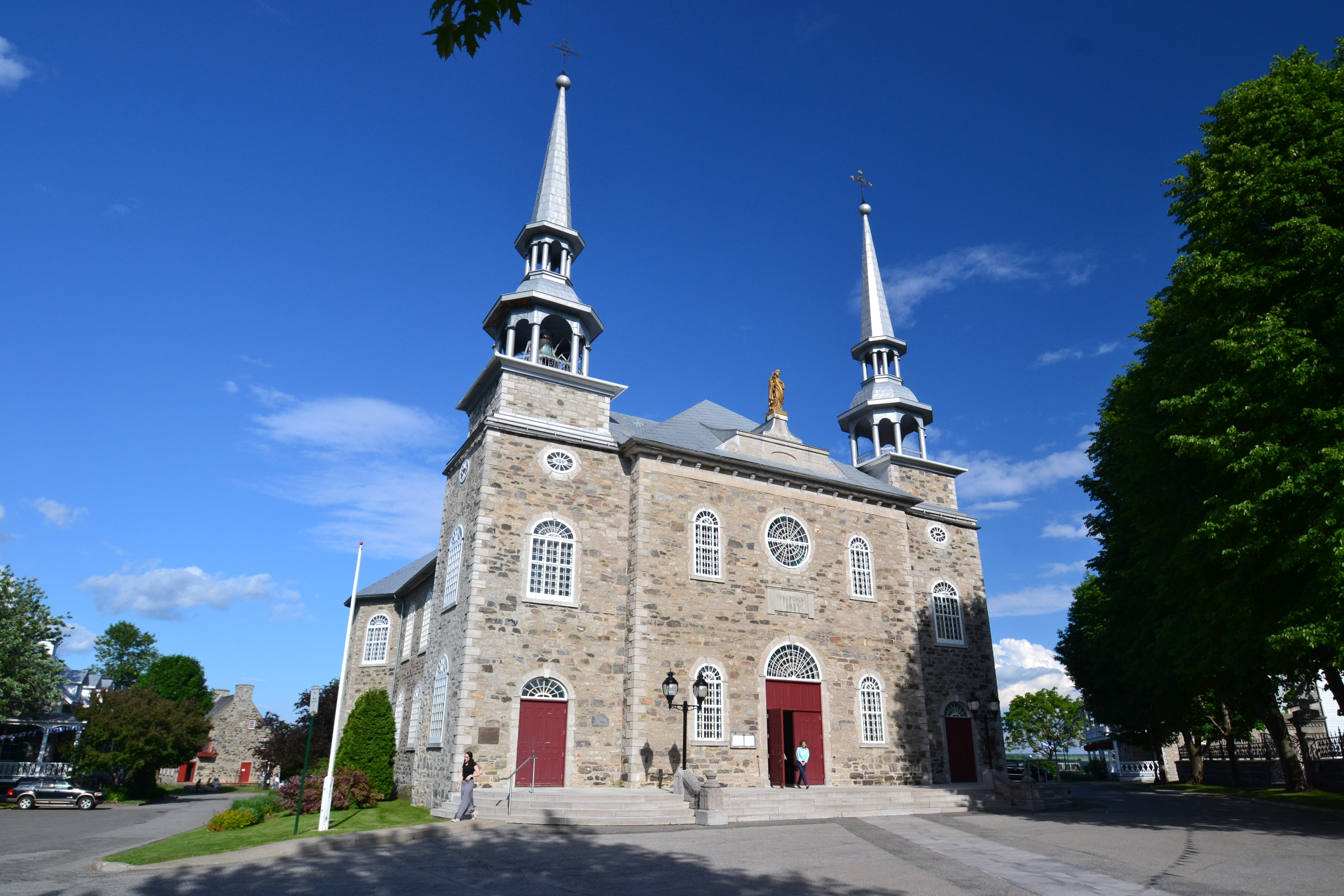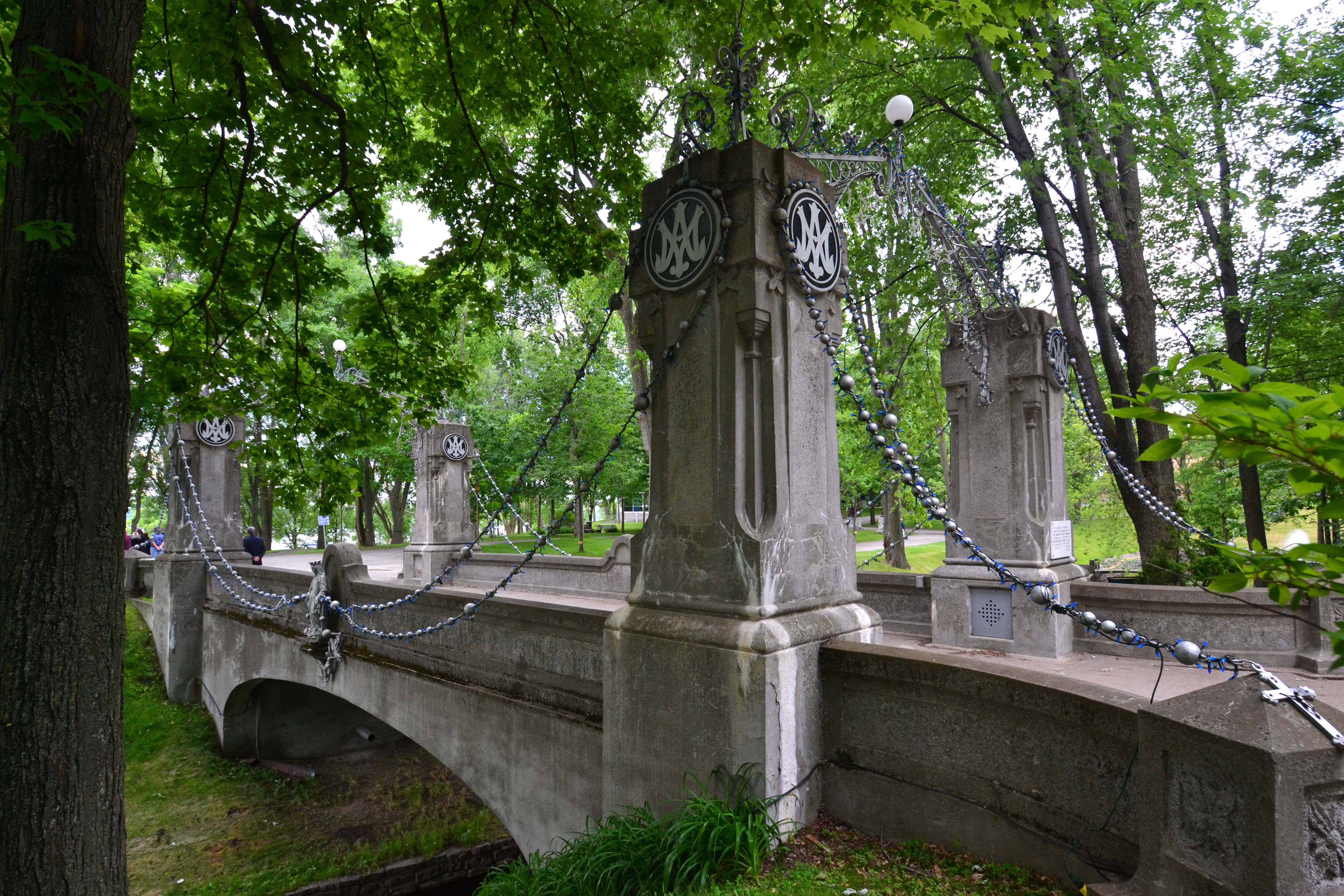 We read about the Moulin Seigneurial de Porte du Lac, an old flour mill. We drove by it and it looked cute, but we were ready to get going. As we got more into Trois Rivieres, I saw that it was more of a blue collar, industrial type city. We stopped at the Notre-Dame du Cape Basilica, which translates to Our Lady of the Cape Shrine. It was a hexagon-shaped stone structure with high-pitched roof lines. However, the interior was not as impressive. What was even more strange was there was a complete visitor center with large restaurant and shops. I learned later that many take pilgrimage trips here. Outside the grounds offered walking trails. We overheard a tour guide giving a tour and walked over a beautiful bridge called the Rosary Bridge. We also loved the original church building which appeared to be hosting a mass right then.