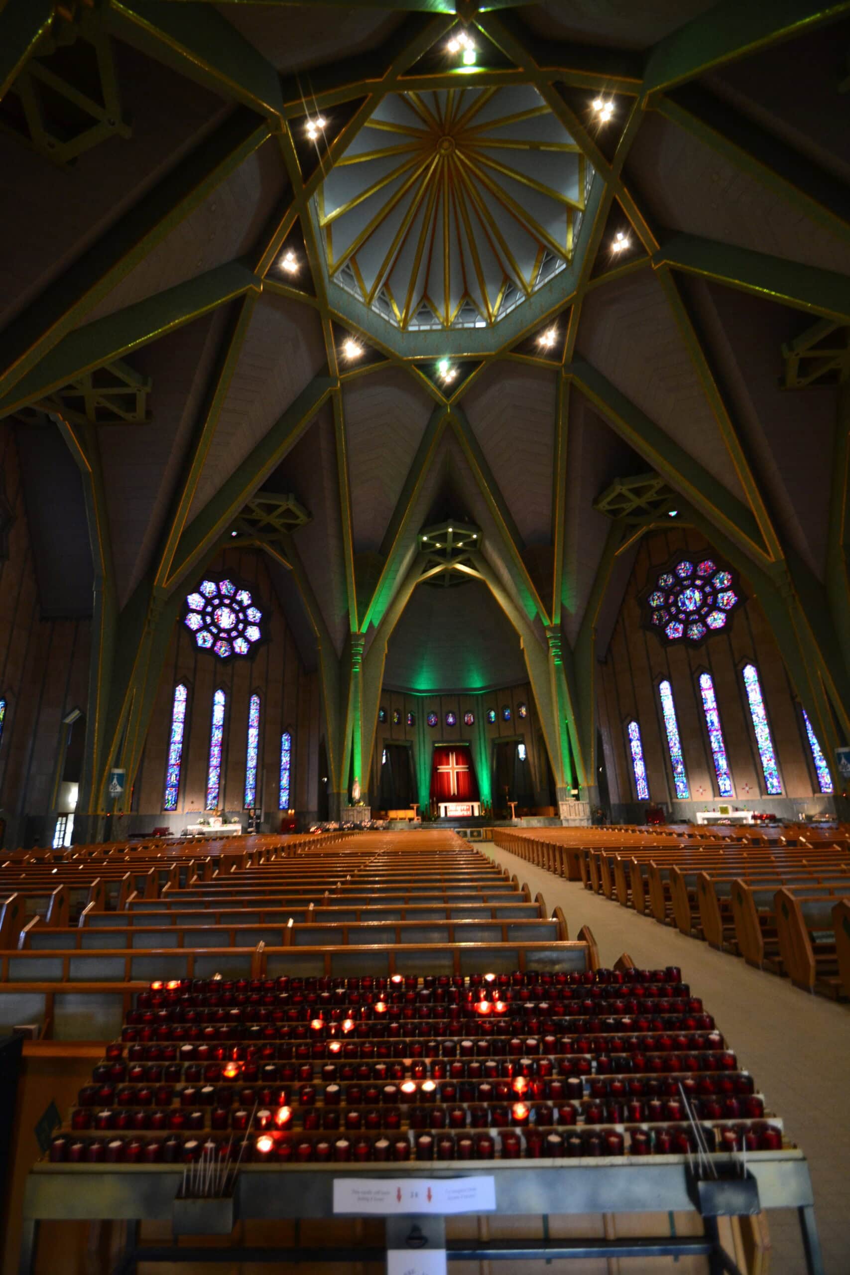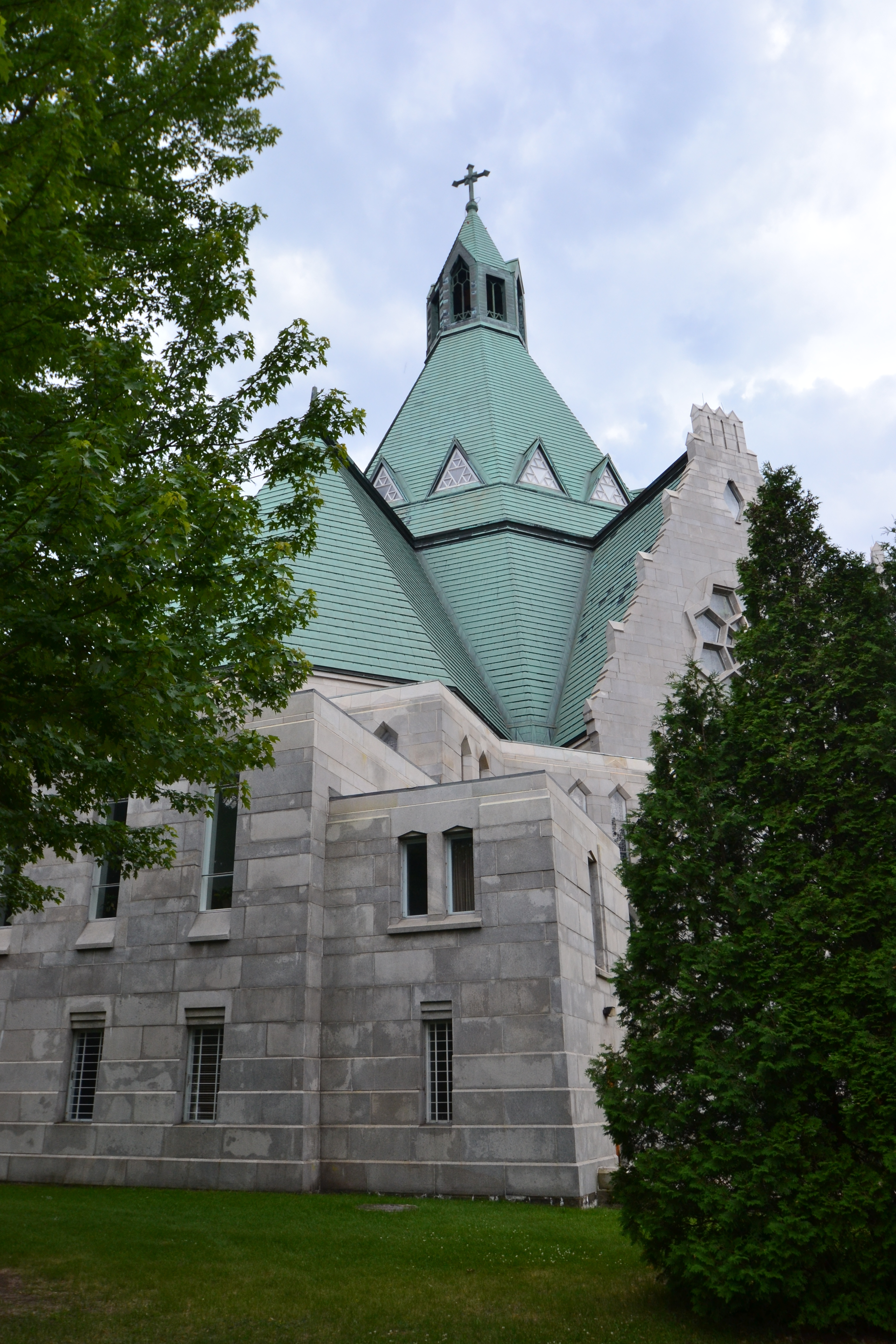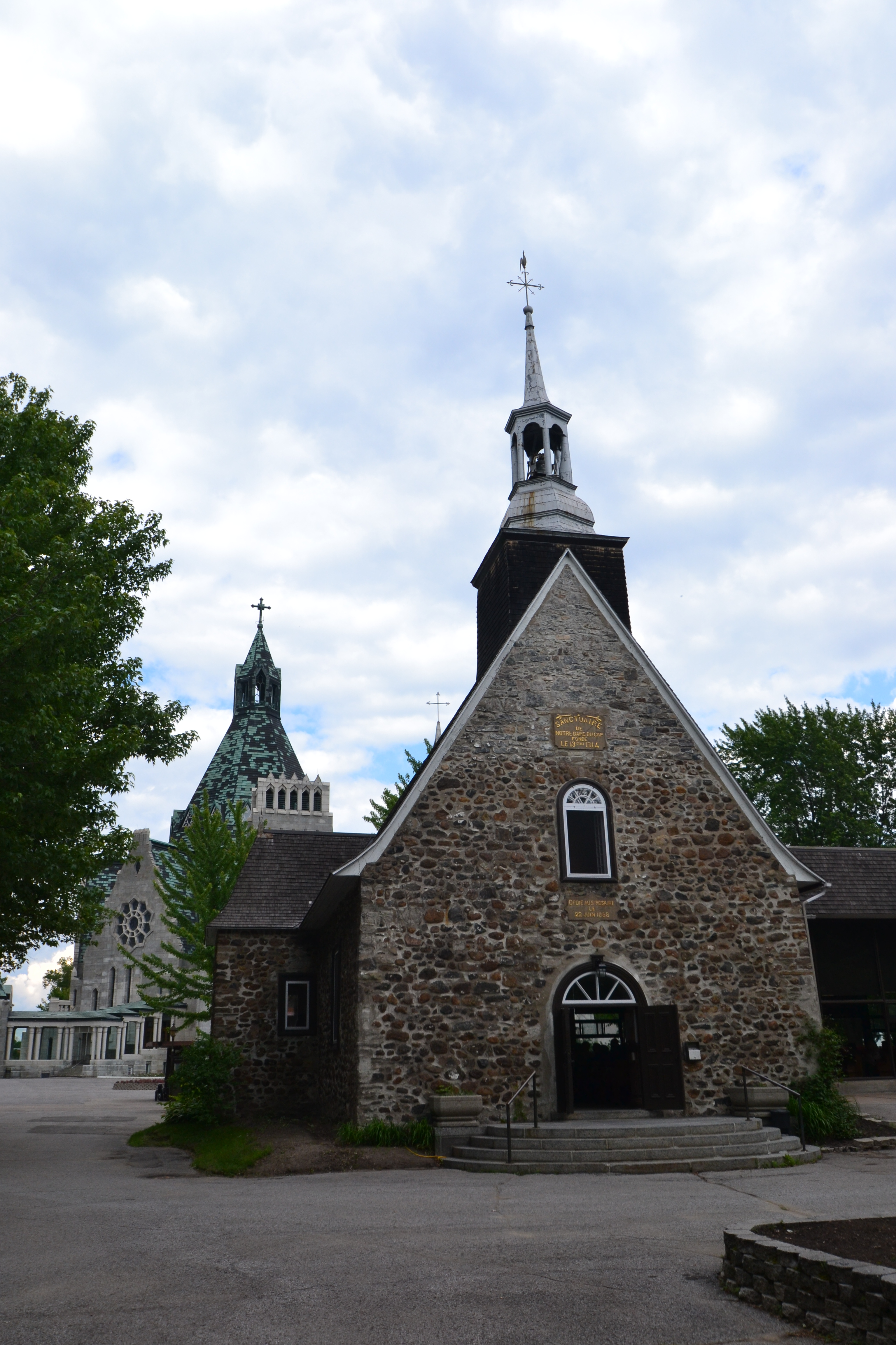 We read about the Moulin Seigneurial de Porte du Lac, an old flour mill. We drove by it and it looked cute, but we were ready to get going. As we got more into Trois Rivieres, I saw that it was more of a blue collar, industrial type city. We stopped at the Notre-Dame du Cape Basilica, which translates to Our Lady of the Cape Shrine. It was a hexagon-shaped stone structure with high-pitched roof lines. However, the interior was not as impressive. What was even more strange was there was a complete visitor center with large restaurant and shops. I learned later that many take pilgrimage trips here. Outside the grounds offered walking trails. We overheard a tour guide giving a tour and walked over a beautiful bridge called the Rosary Bridge. We also loved the original church building which appeared to be hosting a mass right then.