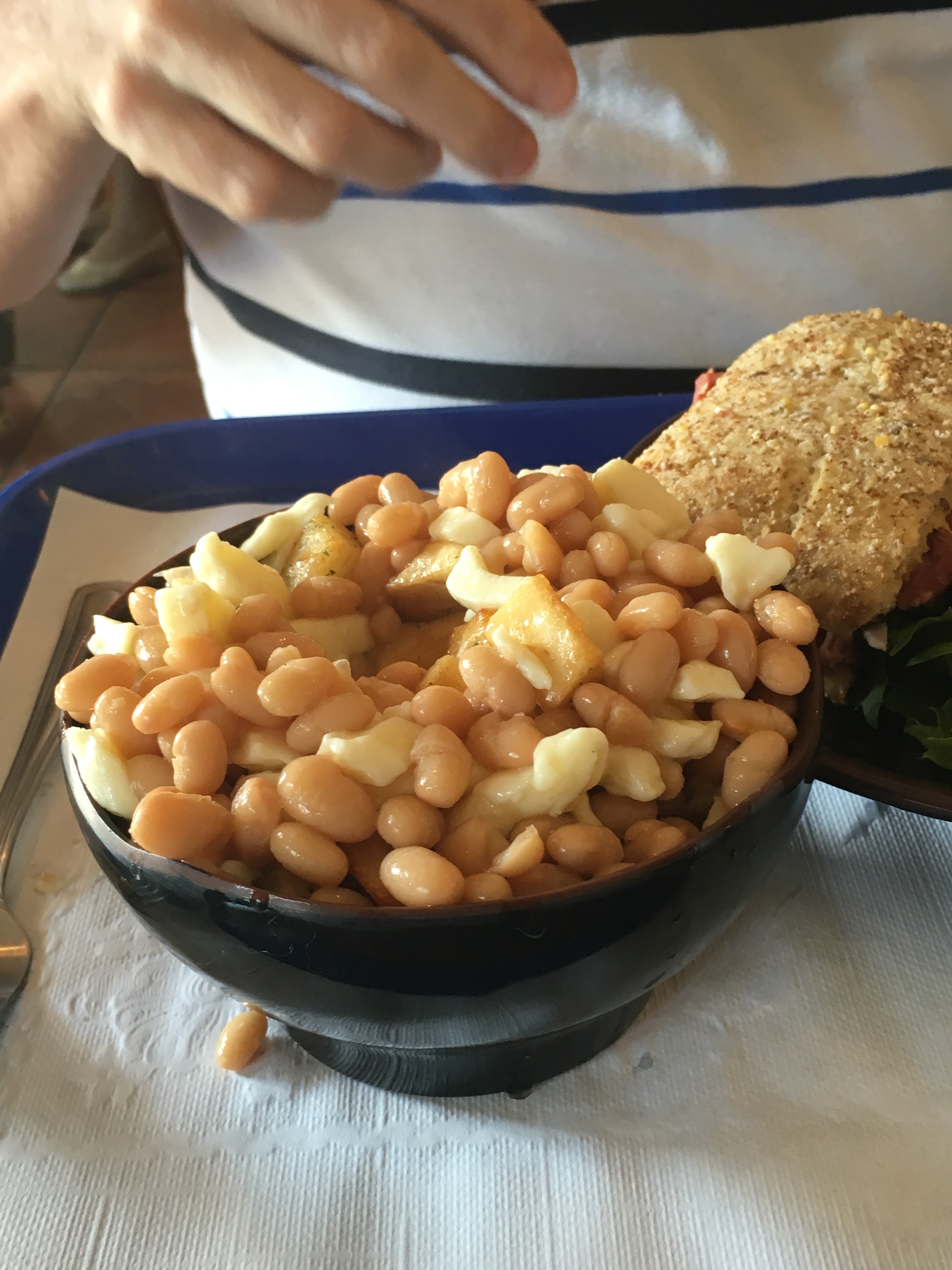 Inside, the bakery type cafe, the menu was completely in french and boy was I rusty. I saw jambon, but couldn’t remember that it was ham. It was thrilling and frustrating at the same time. I ordered a sandwich. Bill had the poutine. She pointed to four different sauces – sucre (I knew it meant sugar) meant sweetened, the others I couldn’t tell you so we ordered plain. It was delicious. This poutine was like cheese curds over baked beans. It was my favorite although DH had some with quail that he liked better later in the trip.