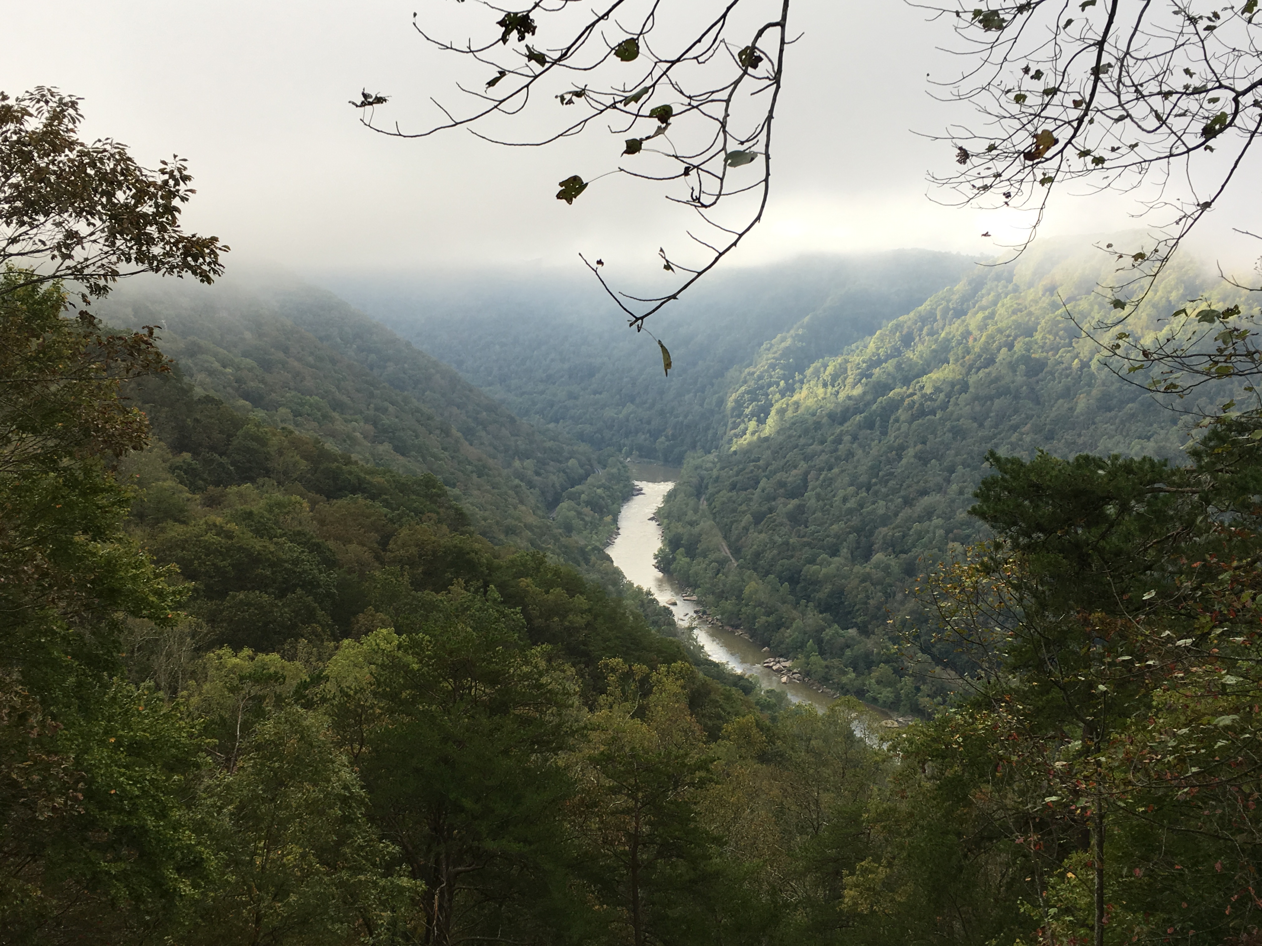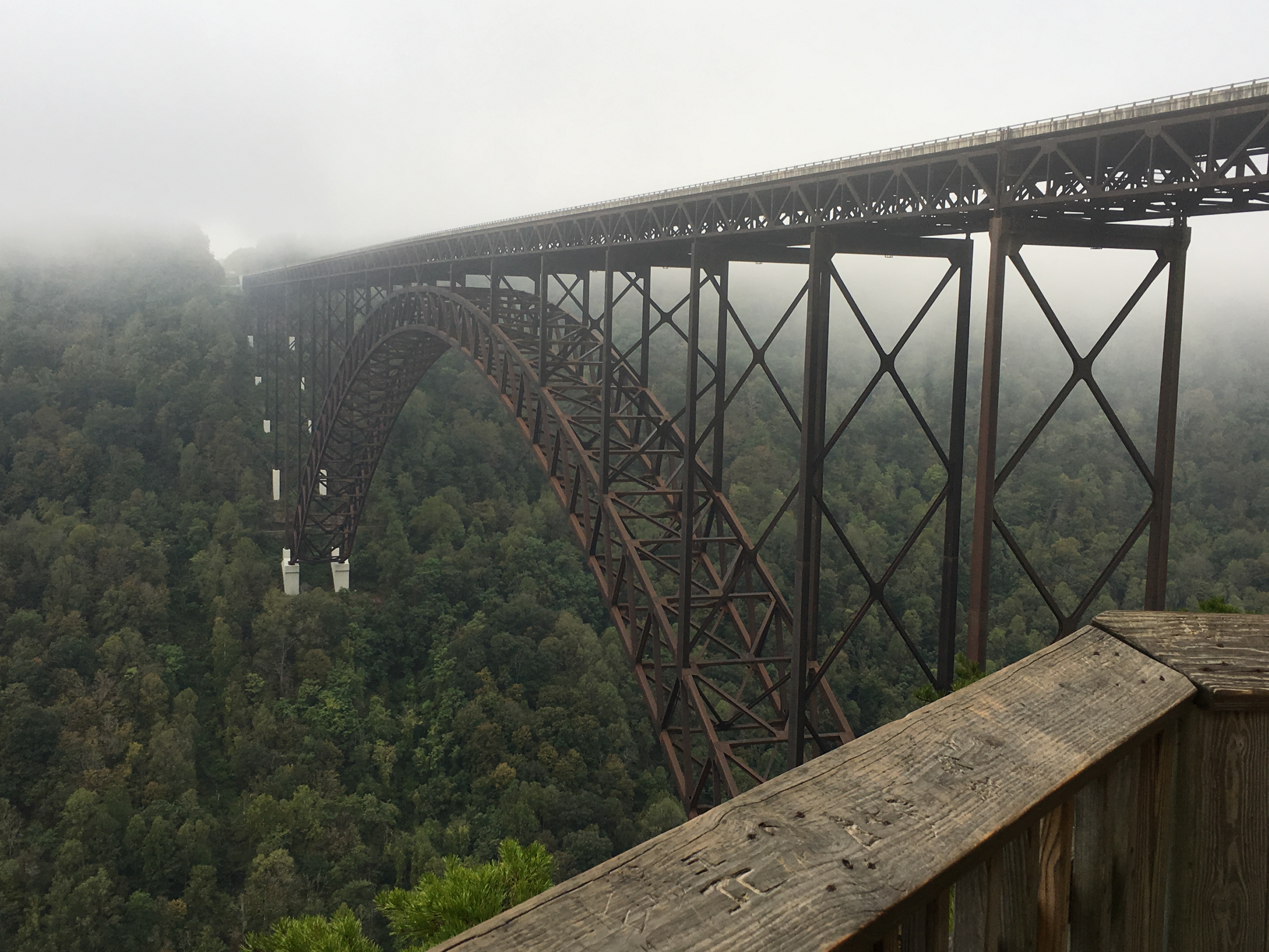 On our last day, sunny skies abounded. However, as we neared the New River Gorge Bridge*, patches of fog settled on the road. By the time we got to the viewpoint, there was no view.