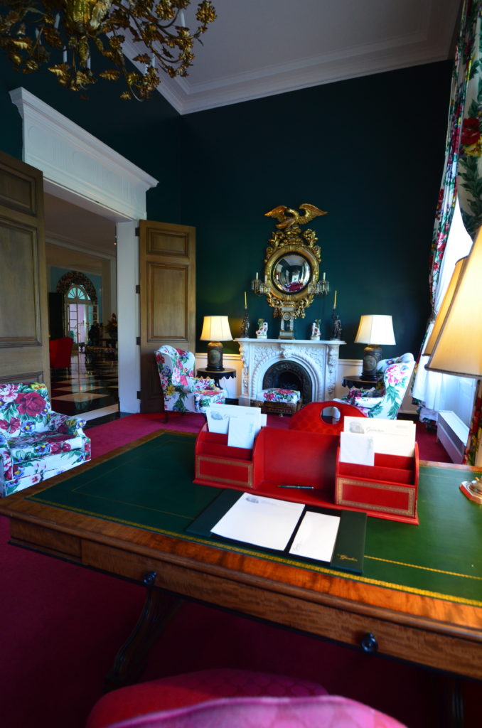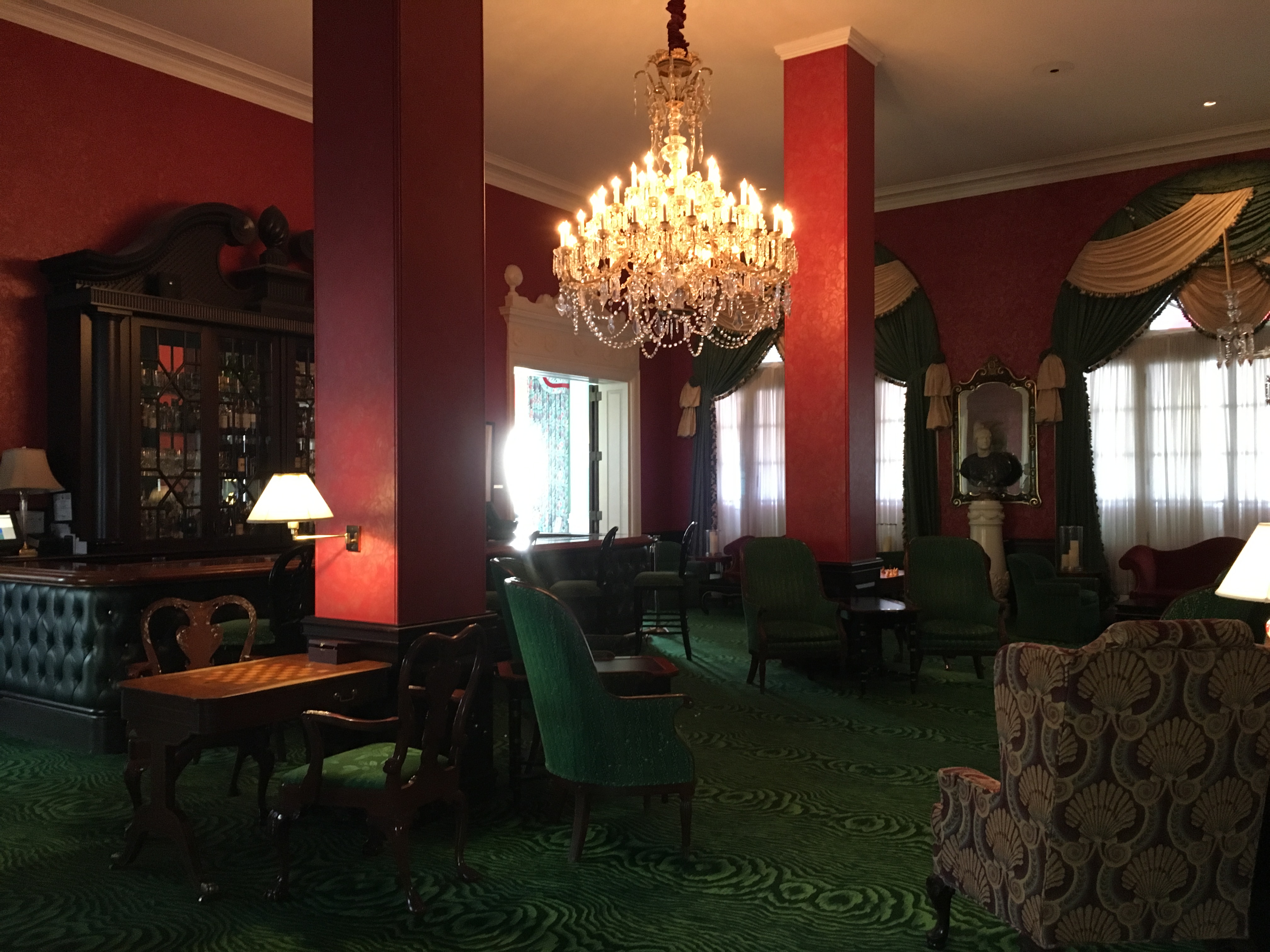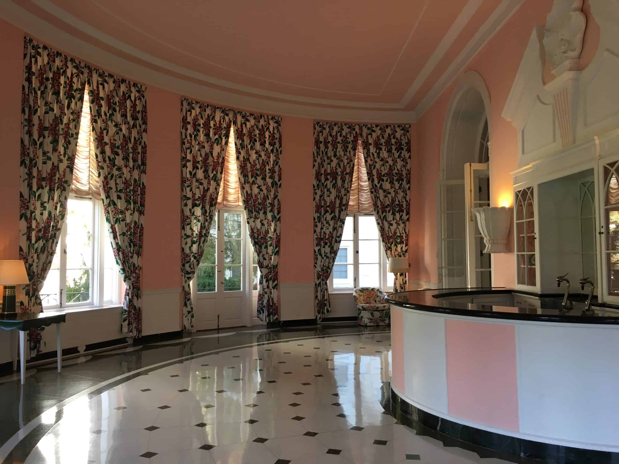 We kept walking through lobby after lobby. The formal writing room fronted the back of the building. To the right of it was what I’d call a gentlemen’s parlor with forest green furniture, a bar and backgammon tables. A large pink ballroom was next followed by the North lobby.