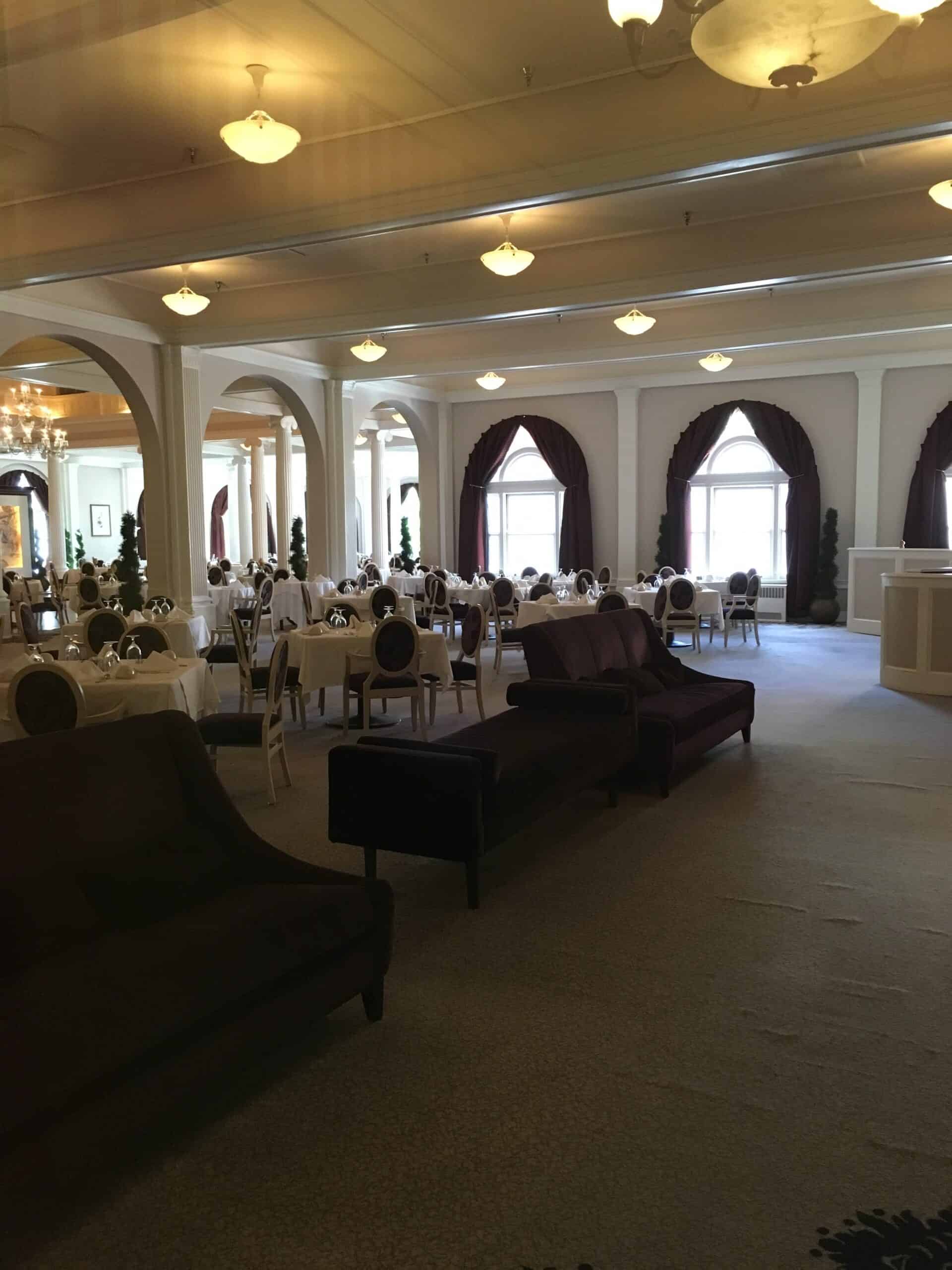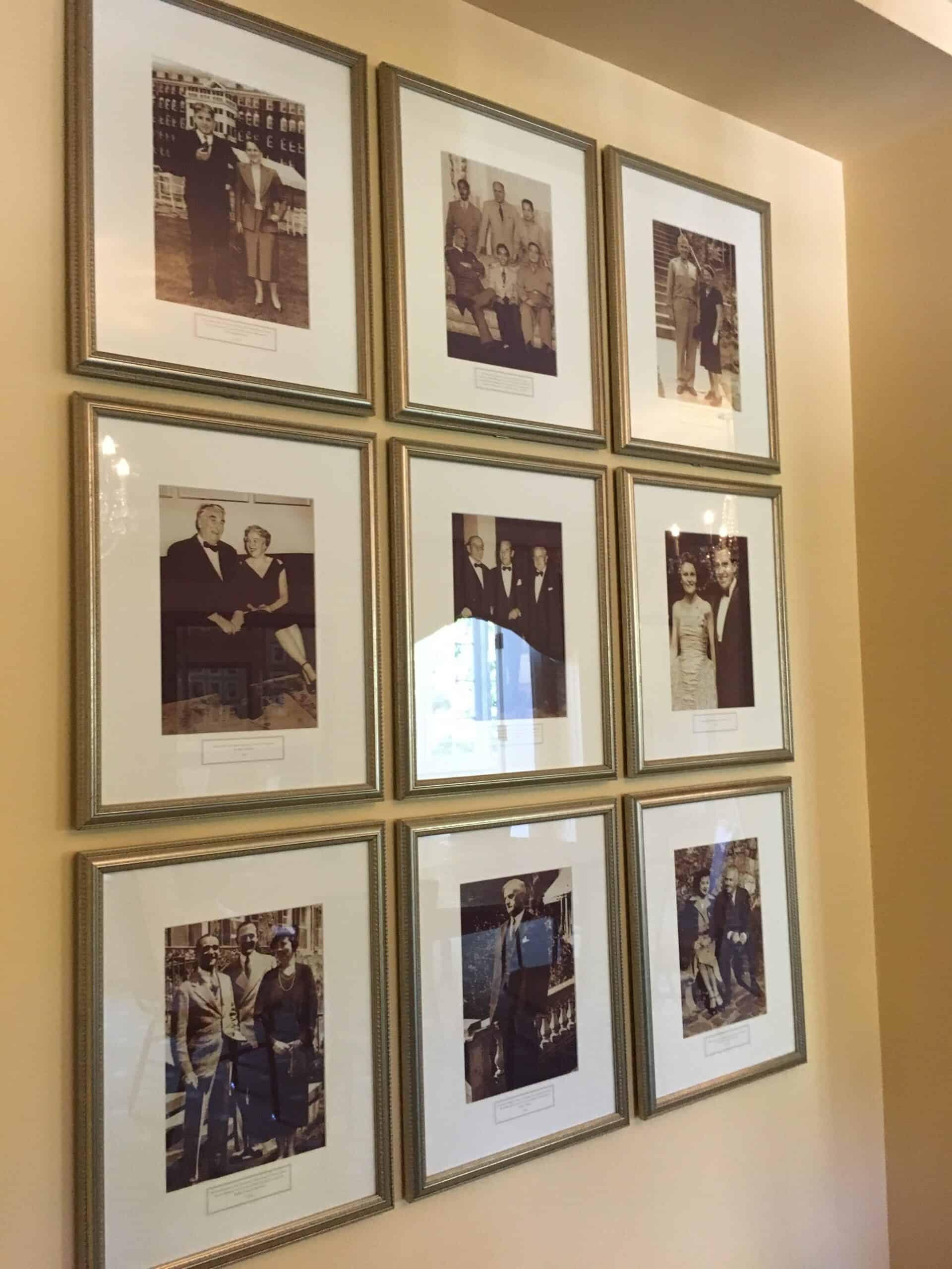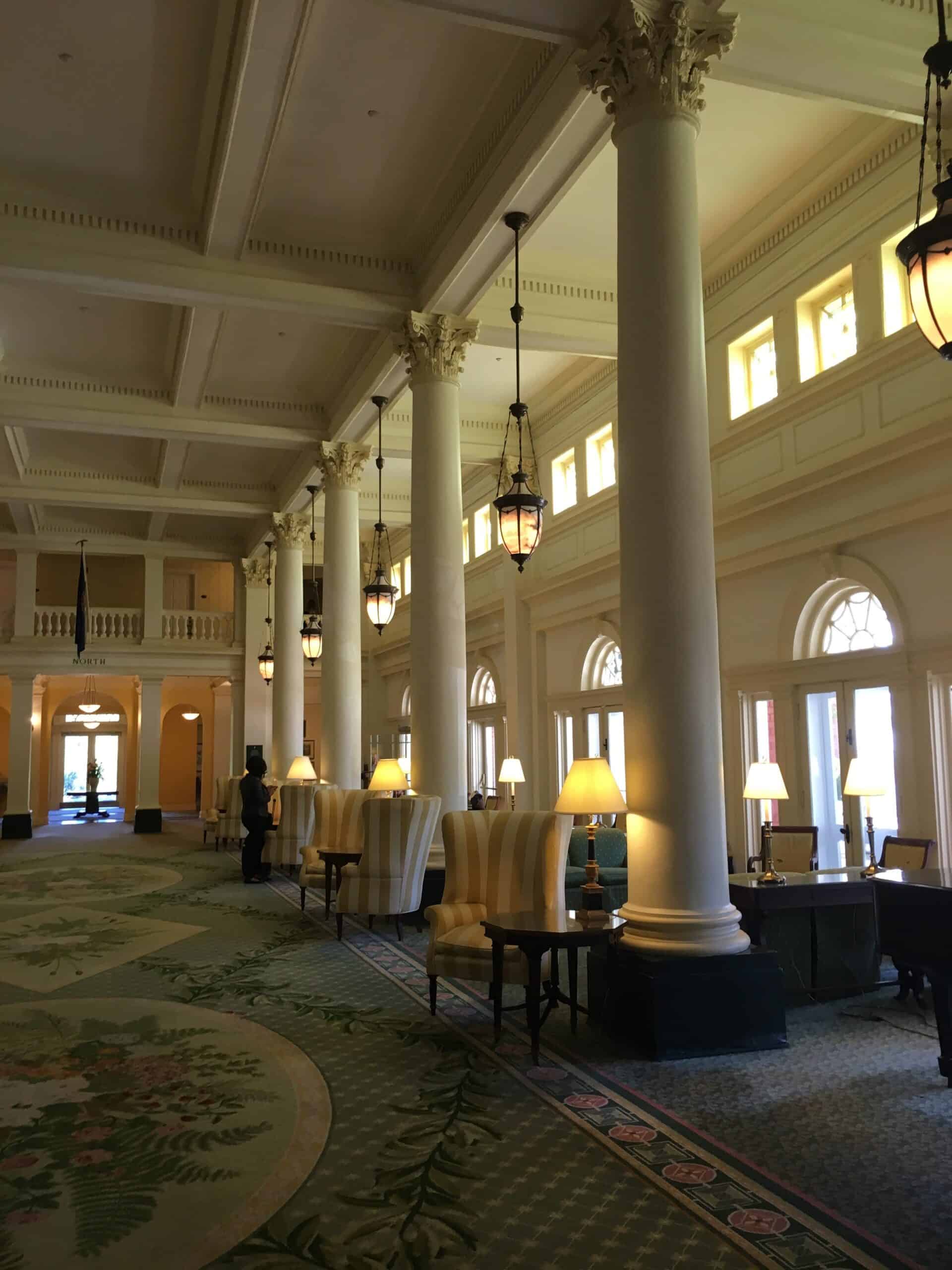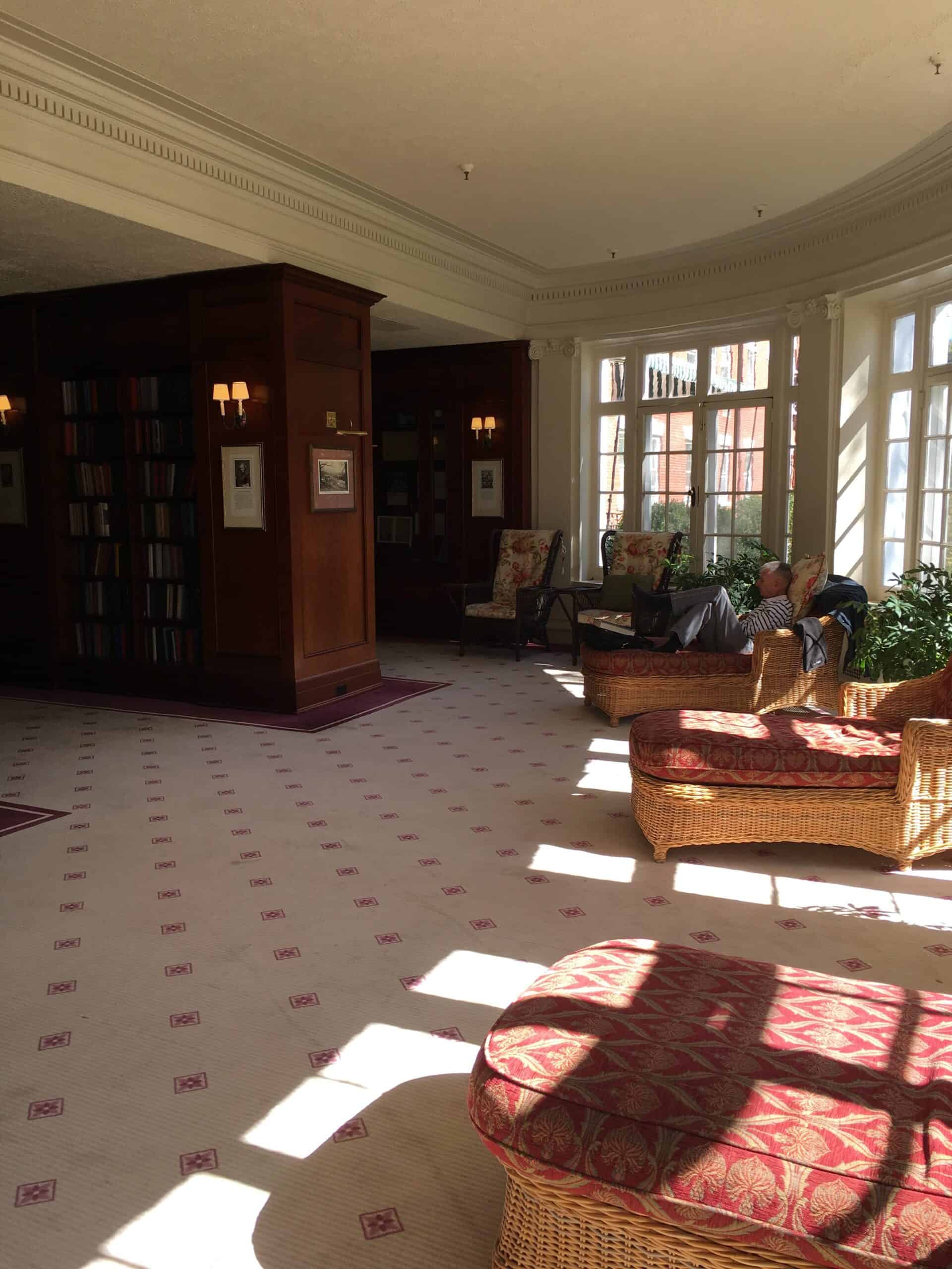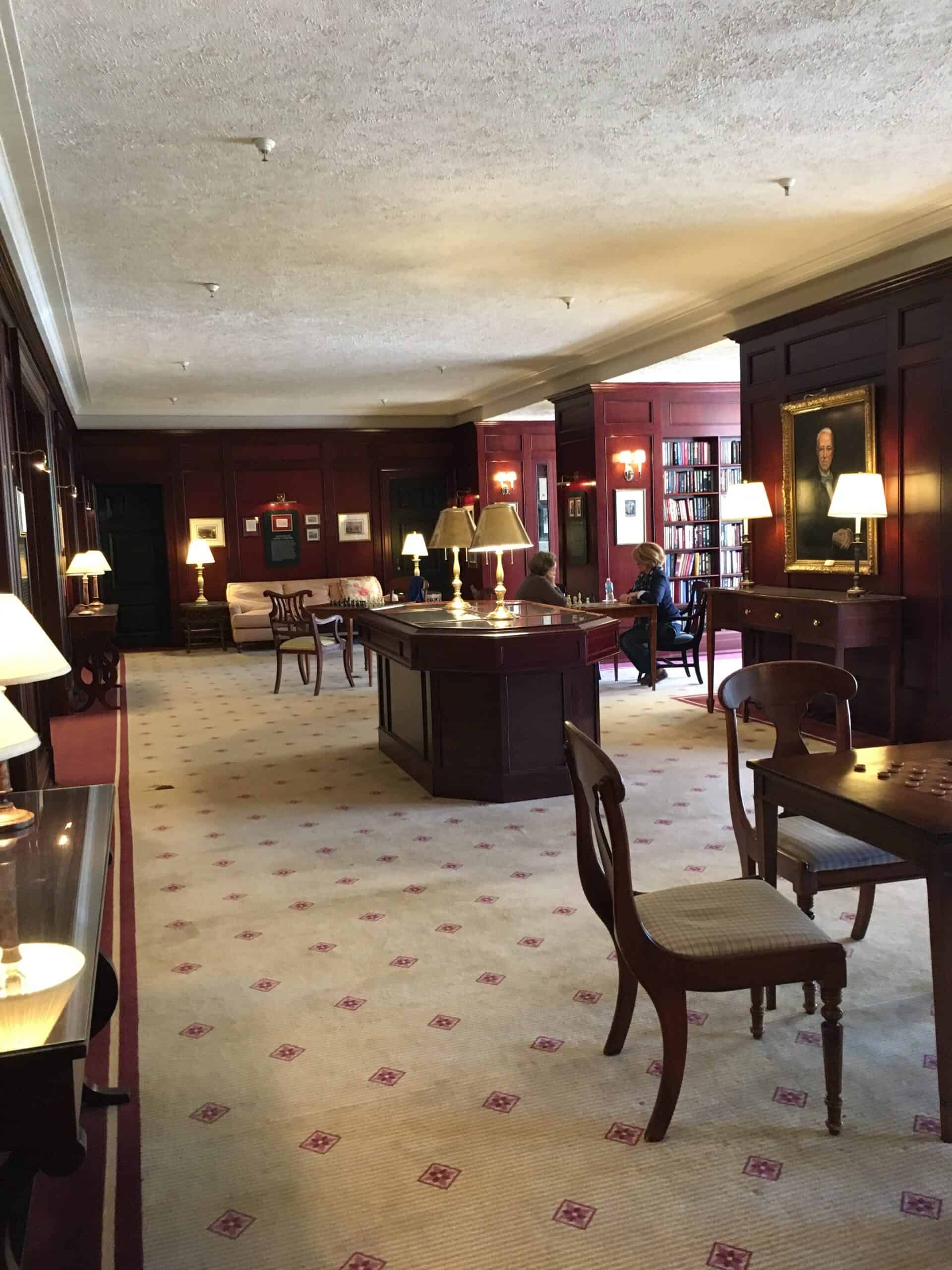 We veered towards the right past Martha’s (like a Starbuck’s with coffee and pasty counter service) to the George Washington Library. Two women played a game of checkers. Pictures of famous dignitaries who visited the resort flanked the book-lined cases. On the other side, visitors sat on floral lounge chairs in a light-filled sunroom. This is the front of the Tower, which was built in 1929 as an addition to the property.