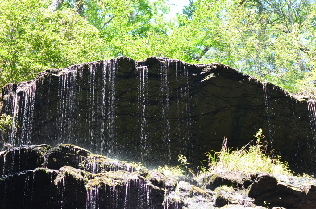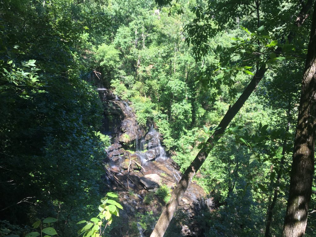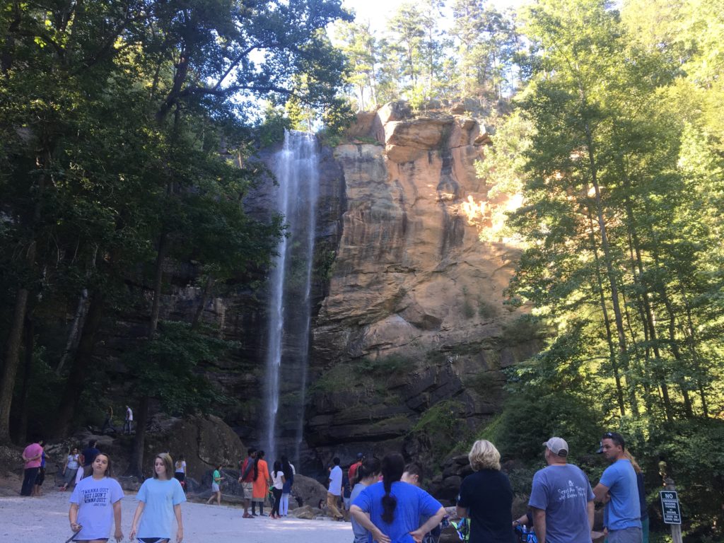 After leaving South Carolina, we took a windy path to Toccoa, Georgia. I’d heard there are falls you can almost drive up to on the Toccoa Falls College campus. Our map directions took us to the wrong part of the campus, but a helpful person gave us directions. Some of us were tired and cranky and opted to stay in the car. We went into a Visitor Center, walking through a gift shop and towards the back of the building. I had no idea what to expect. So far, I wasn’t impressed. We continued to walk a few feet and there it was – a tall, really tall waterfall.