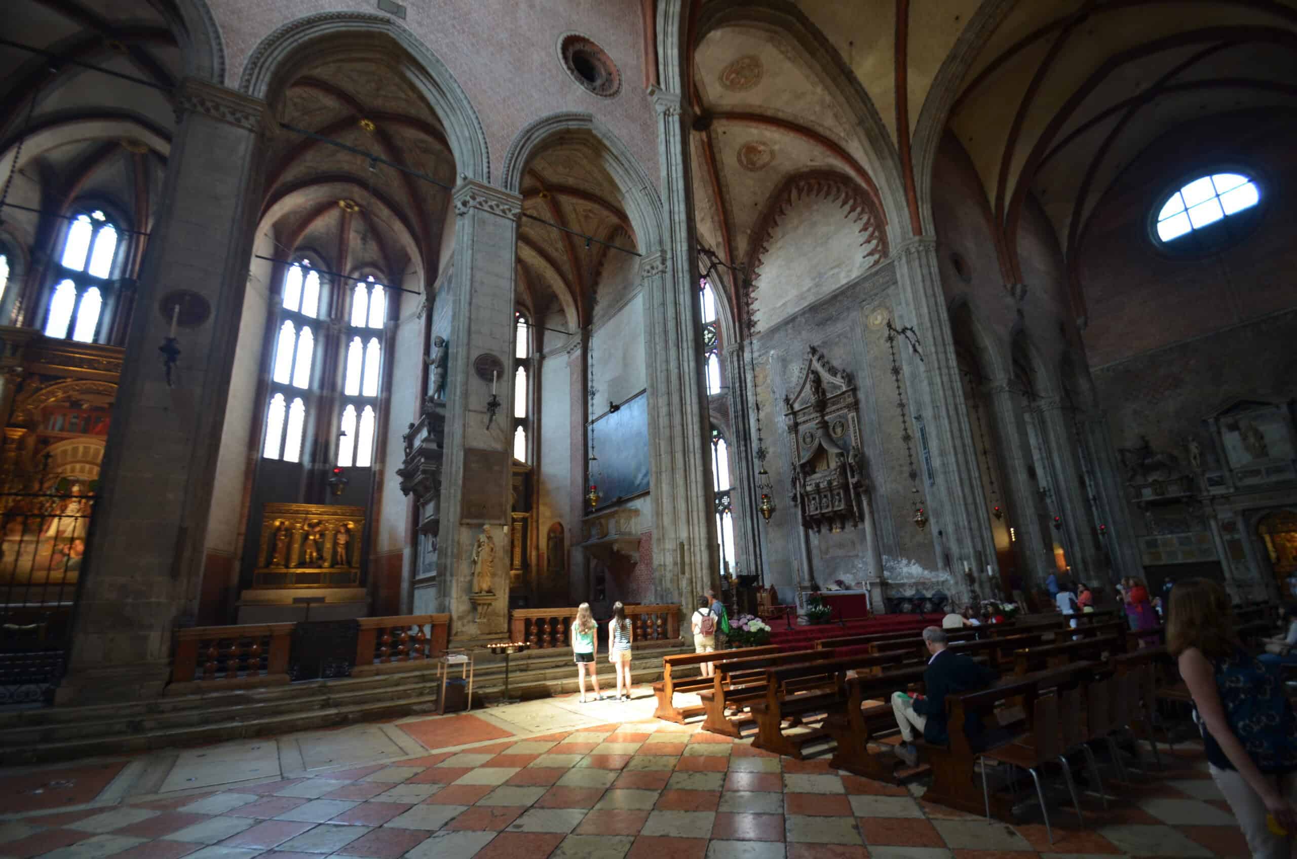 The next morning we breakfasted at our hotel and set out for the Frari Church. Located near the Piazzole Roma (and further from St. Mark’s Square), this cathedral was less crowded. Tintoretto, Titian and others’ paintings graced the walls of the caverness holy space. I felt I was in a museum, but no – this is an active cathedral and these paintings and sculptures were commissioned to be here. We did download the Rick Steves’ Frari Church audio guide and it helped tremendously.