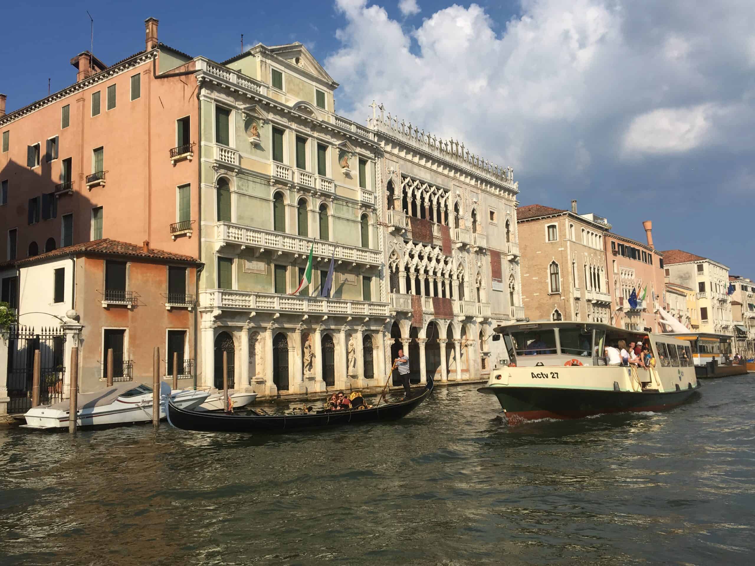 Now to enjoy Venice! We downloaded the Rick Steves free audio guide of the Grand Canal cruise on two of our phones. We split the ear buds between one of us and one of our children. By getting on the vaporetto (public water bus) at Piazzale Roma, we were the first ones on the boat and got seats at the very front. The audio tour starts at the next stop, which is the train station.