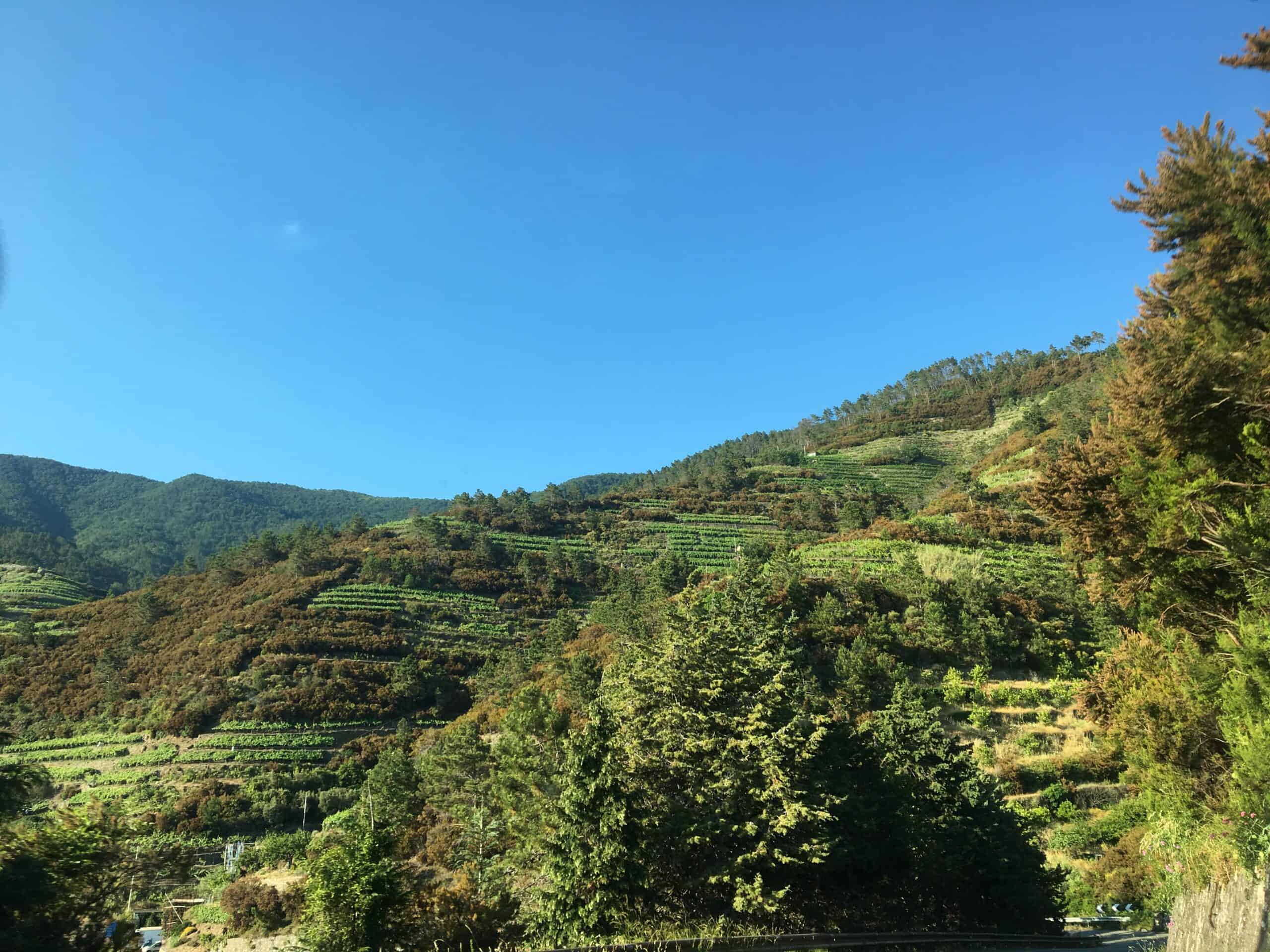 I felt that we couldn’t see more than 2 or 3 villages on our day trip from Genoa. If we were going to see Manarola, it would be this evening and by car. On the 6 km drive, vineyards surrounded us on the windy roads through the mountains.