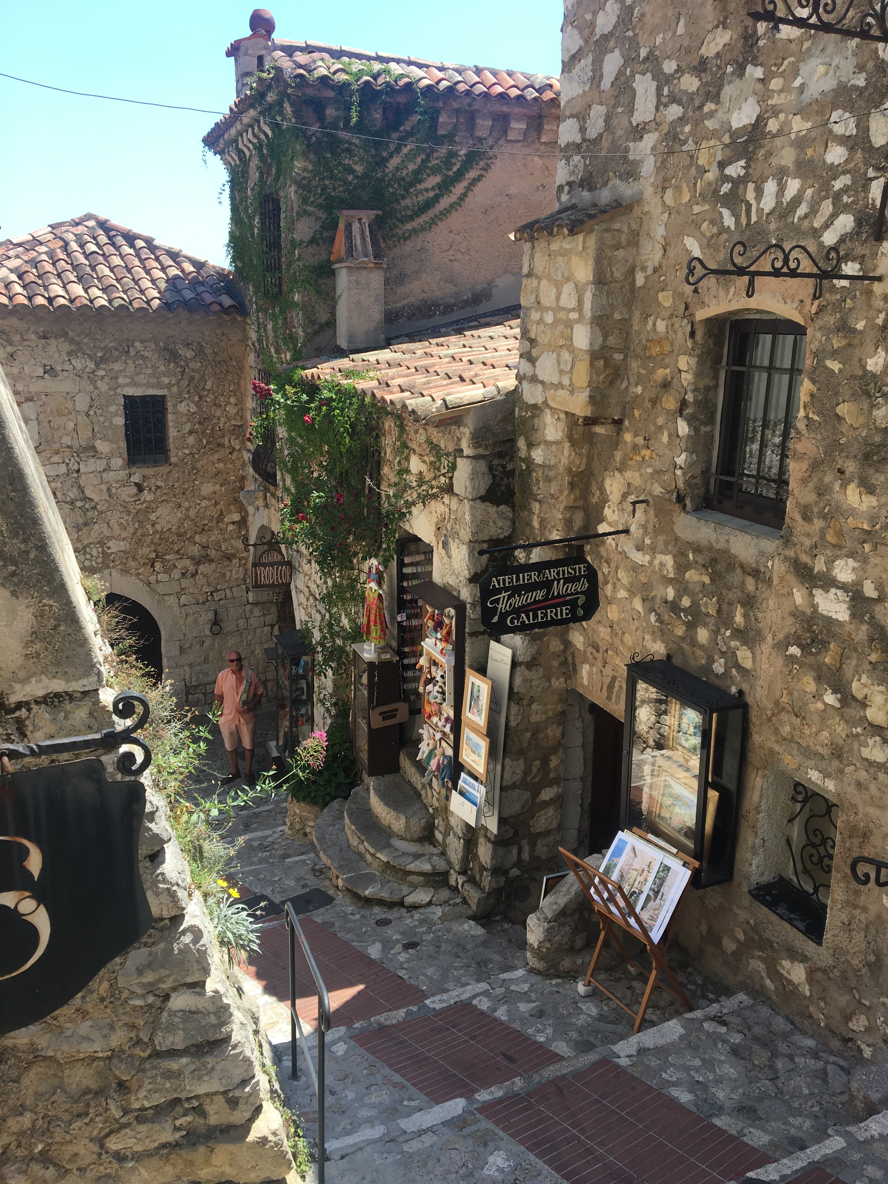 Reportedly, most people take the Basse Corniche, which hugs the coastline through many resort towns. But since we wanted to visit Eze, we chose the mid-level Moyenne Corniche. The 5-mile trip took about 20 minutes as the curvy road hugged the mountainside. At Eze, we parked the car and entered the walled city.