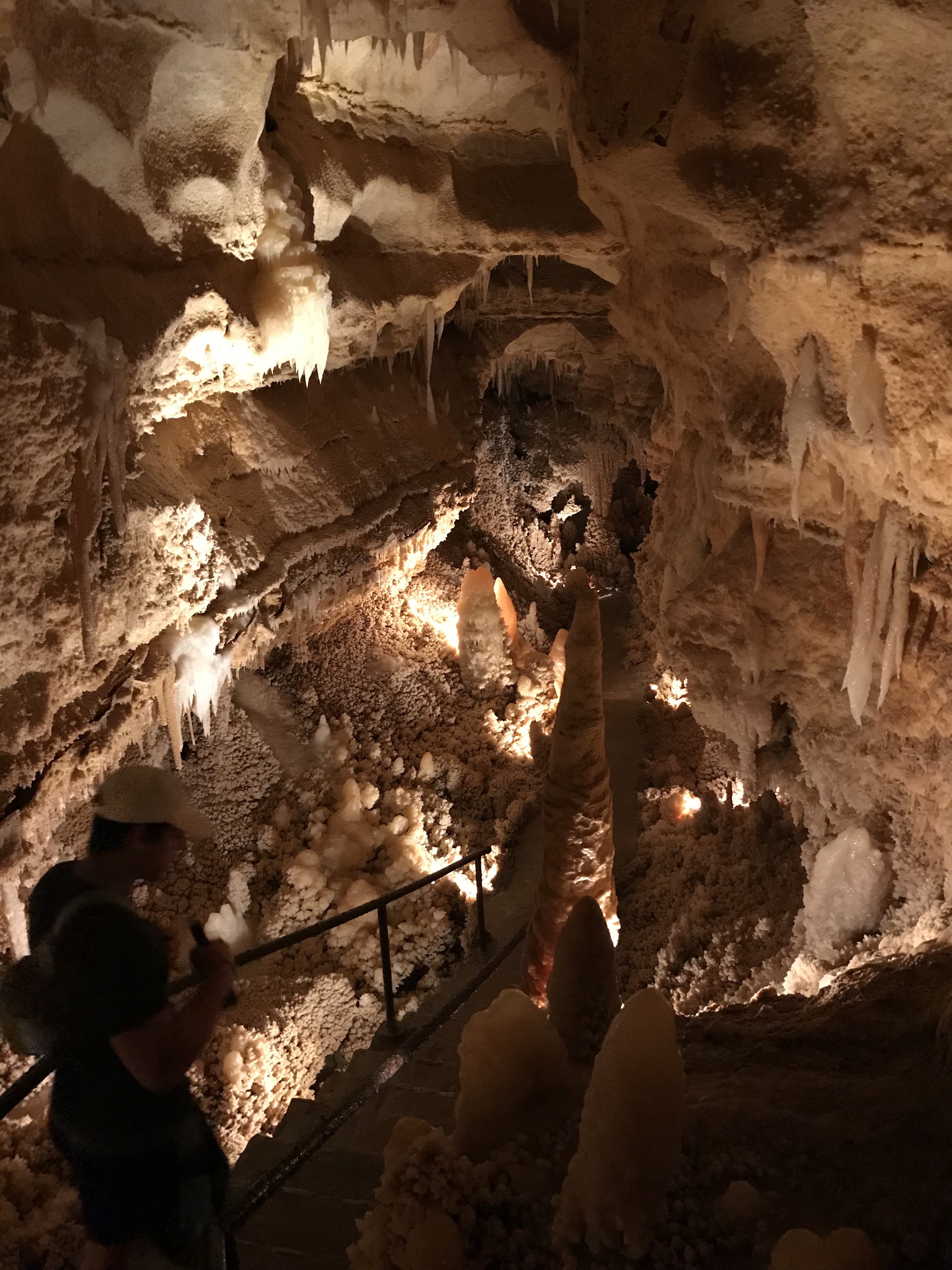 We then went into the Soda Straw Room. Tiny hollow tubes that look like “soda straws” hung from the ceilings. These are very delicate and can snap off with just a tiny bump. Because of this, they don’t allow purses, backpacks or camera bags on the tour. Additionally, they recommend you take off jackets before entering the cave. At 72 degrees, you don’t need additional layers. They don’t let you take them off and tie around your waist for the very same reason that you may accidentally bump into a cave formation and cause unintentional, yet irreparable, damage.