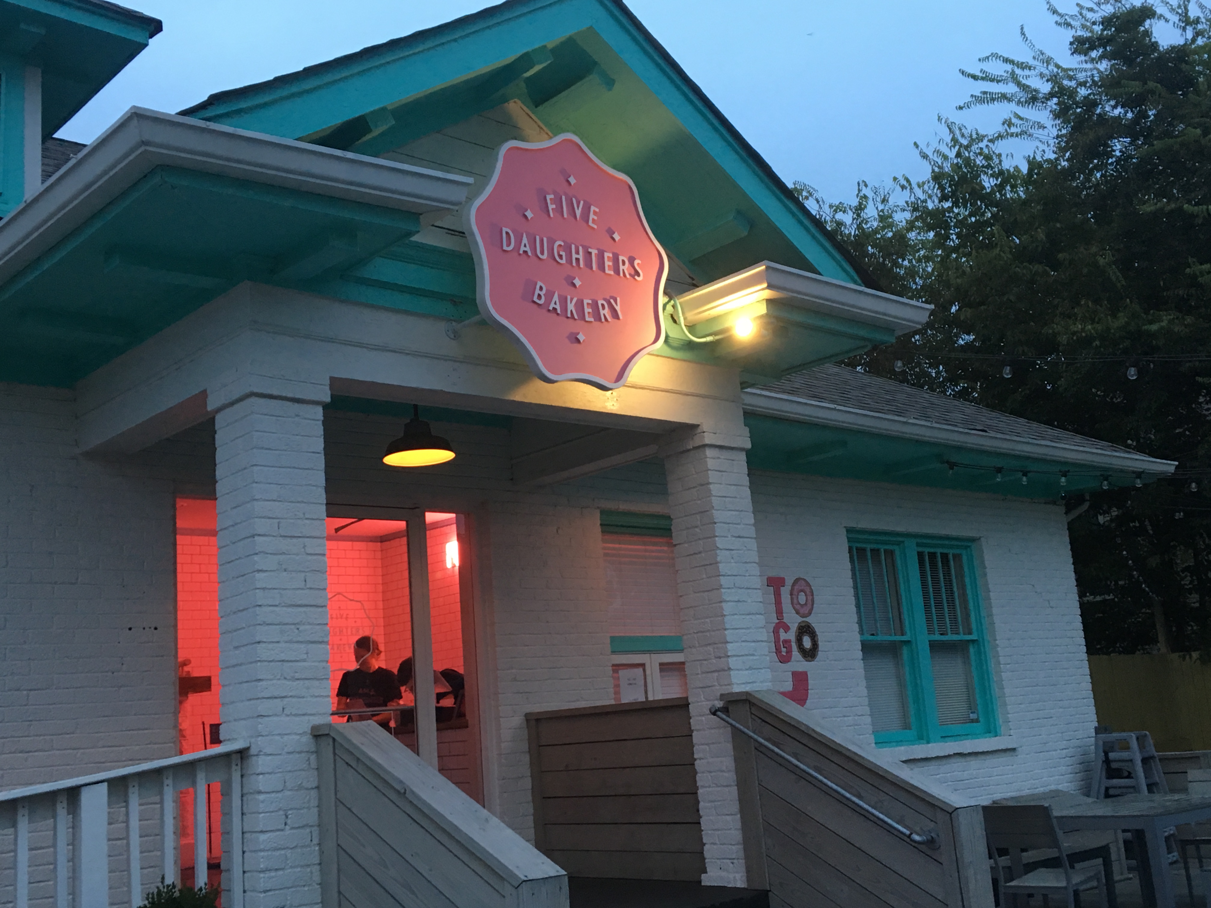 My friend’s daughter recommended that we try a dinner spot in the 12th Avenue South area. Not far, but still a drive from Vanderbilt, we found parking on a side street. After putting our name on a list at Burger Up, we walked around. Not yet dark, the place was bustling with activity. We had heard about Five Daughters Bakery and decided to buy their famous 100 Layer Doughnut to eat after dinner. These delicacies take several days to make and are obviously in high demand. Although the bakery stays open until 10 pm, they closed early on this night because they had sold out of all items earlier that evening.