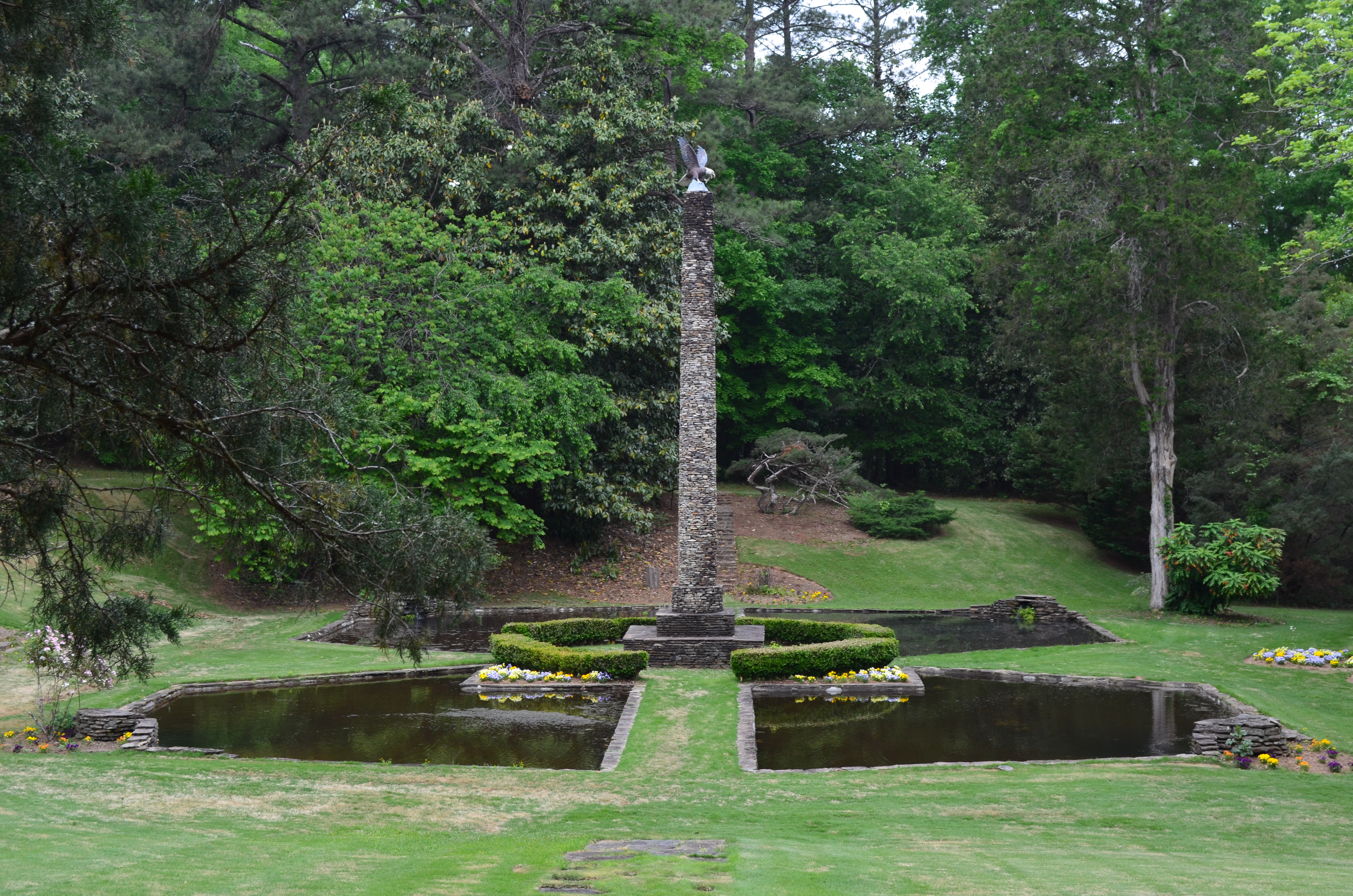 We passed by large white tents where they were setting up for a wedding reception and then arrived at the Arrowhead pools. We read in the brochure that Vaudeville actress Hetty Jane Dunaway started the gardens. She and her husband, Wayne P. Sewell married in Atlanta and then relocated to his family home in Roscoe. There, she spent years developing the property into gardens that became a theatrical training ground during the 1930’s and 1940’s.