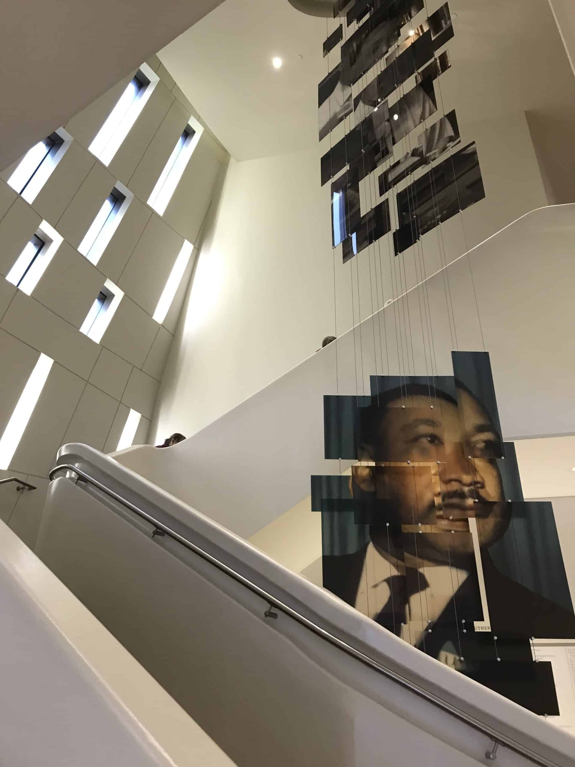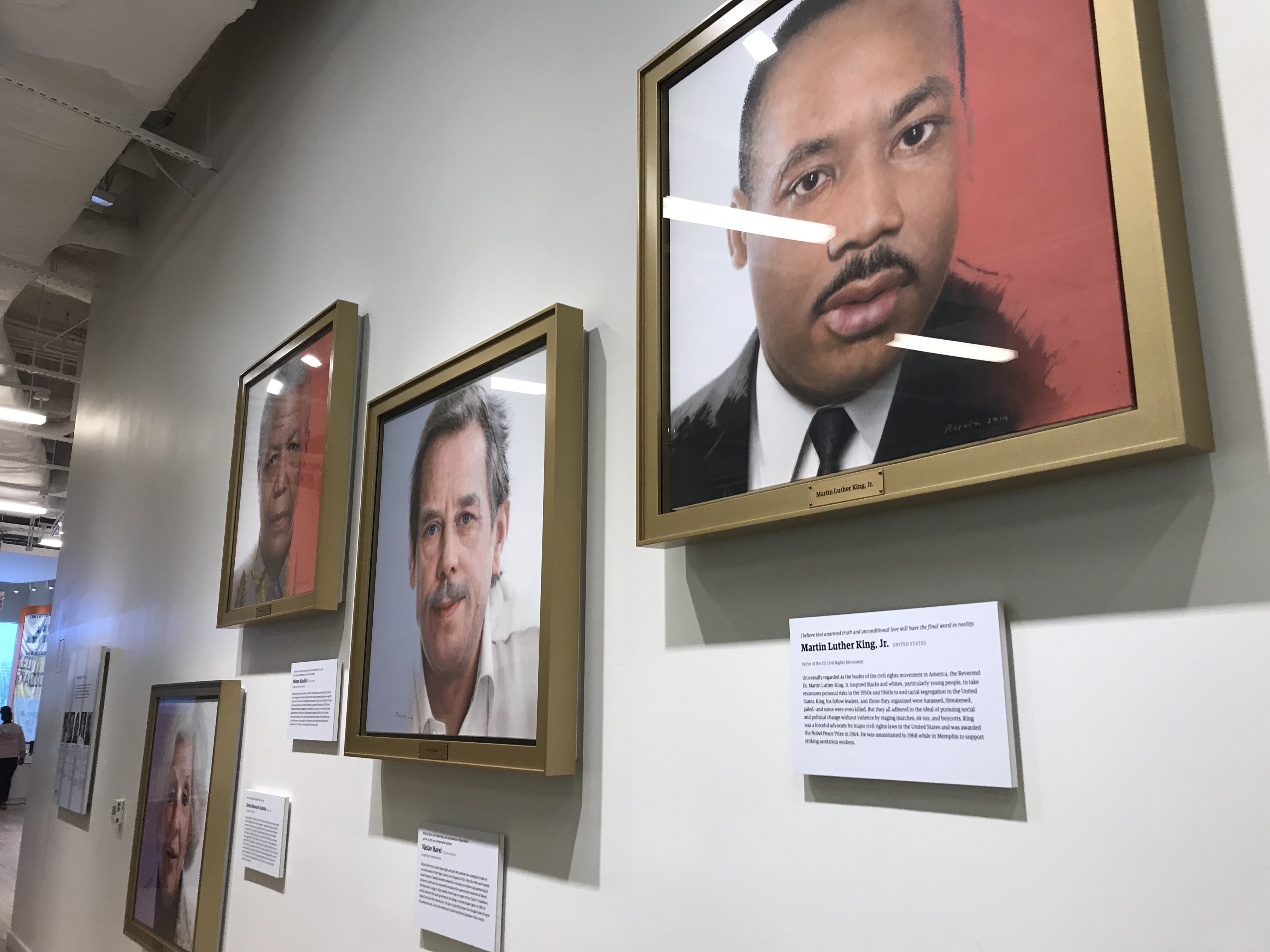 Visitors enter on the second floor of the museum after going through a security checkpoint. Typically, they explore the second floor civil rights exhibit, then follow upstairs to the human rights exhibit. Because larger than average crowds, museum staff told us to start either on the first or third floors.