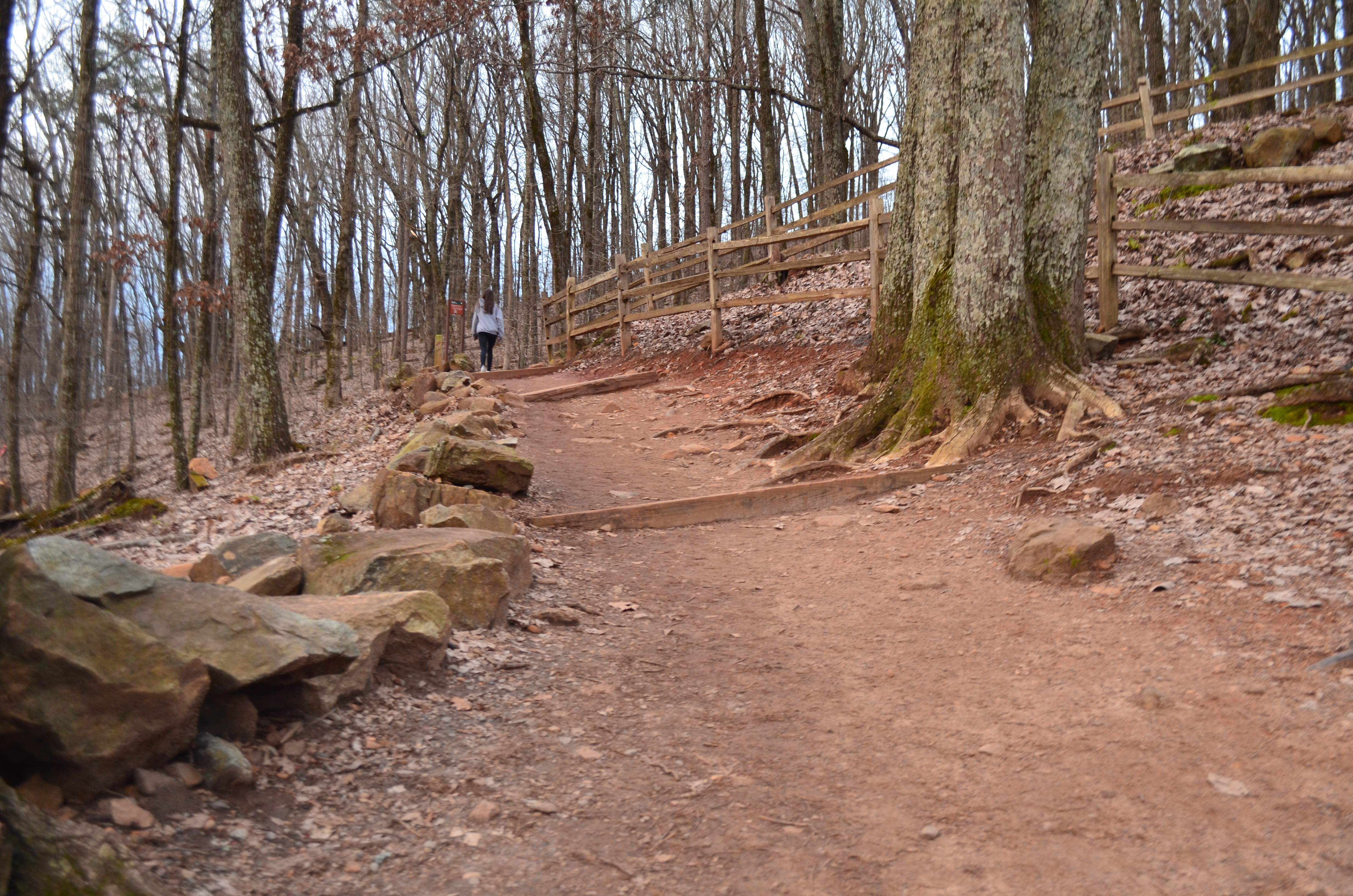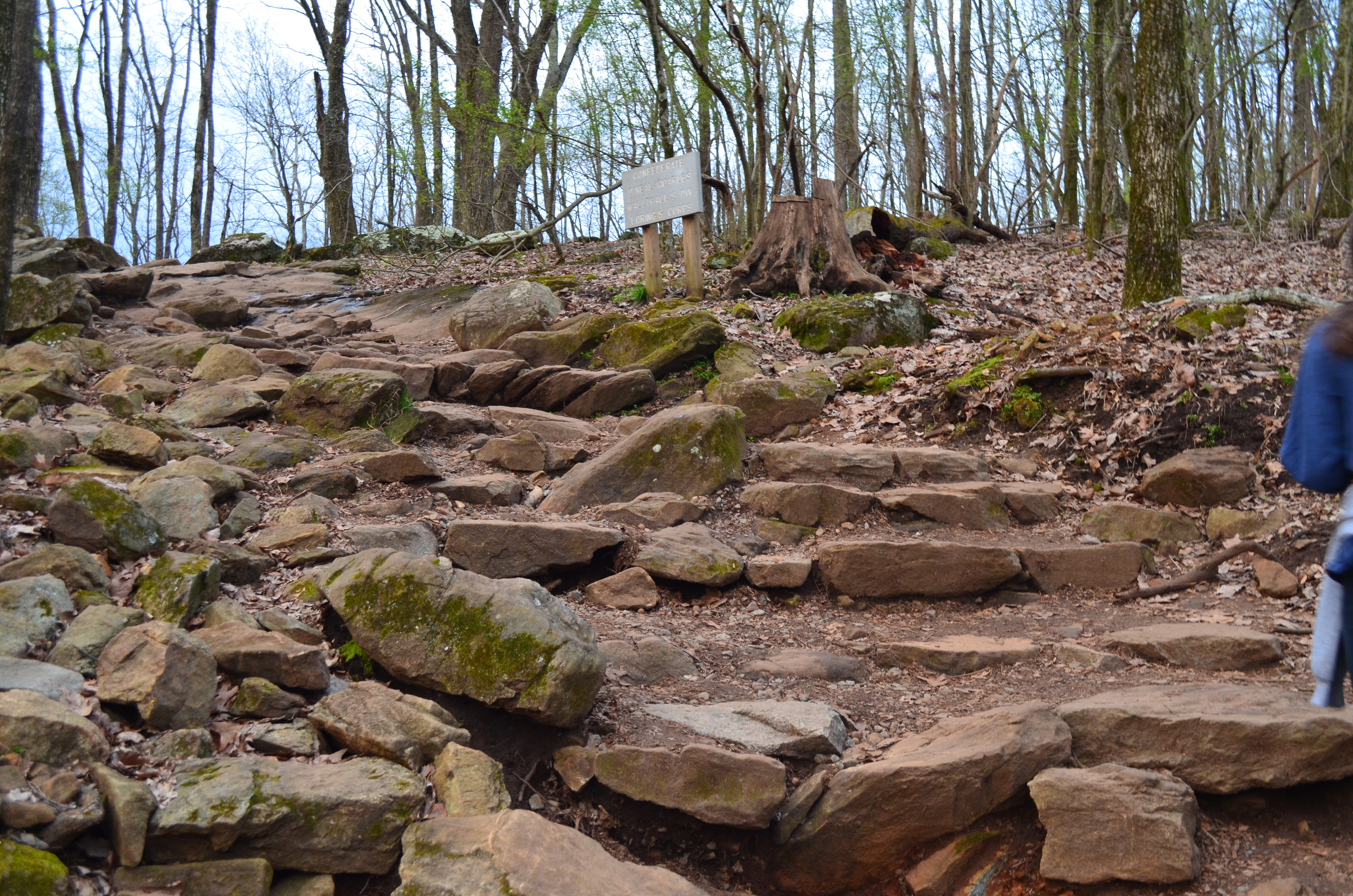From the parking lot, the 1-mile trail to the top of Kennesaw Mountain begins to the right of the visitor center. The path is wide and ascends quickly. I hadn’t stretched before taking the trail so I was trying to catch my breath. Thing 2 was trying to reach the summit by sunrise so we hiked at a fairly fast pace. I should also mention that I was lugging the nicer camera with me, adding to the weight on the trail. Fortunately after one-third of the way to the top, the path flattens out for a short while when it follows an old road bed. Here the width of the trail spans at least 8 feet wide.