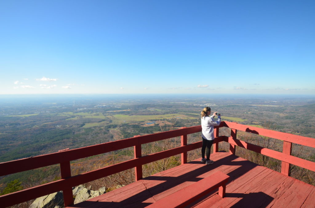 Since we’d already climbed over 600 steps at Amicalola Falls, we chose the easy, 1-mile combination Stone Tower Trail and West Overlook trails. Driving to the top of the mountain, we parked at the Old Fort Picnic Area. In one of the brick shelters, a family was celebrating Thanksgiving and we could smell wood burning from the large fireplace.