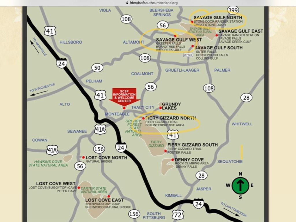 About two-thirds of the acreage lies in the Savage Gulf area near Altamont and Beersheba Springs. Both the Fiery Gizzard section and Grundy Lakes are near Tracy City. The Lost Cove area lies on the western side of I-24 near Sewanee in Franklin County. Although we didn’t stop, a visitor center sits between Lost Cove and Fiery Gizzard in Monteagle, TN.