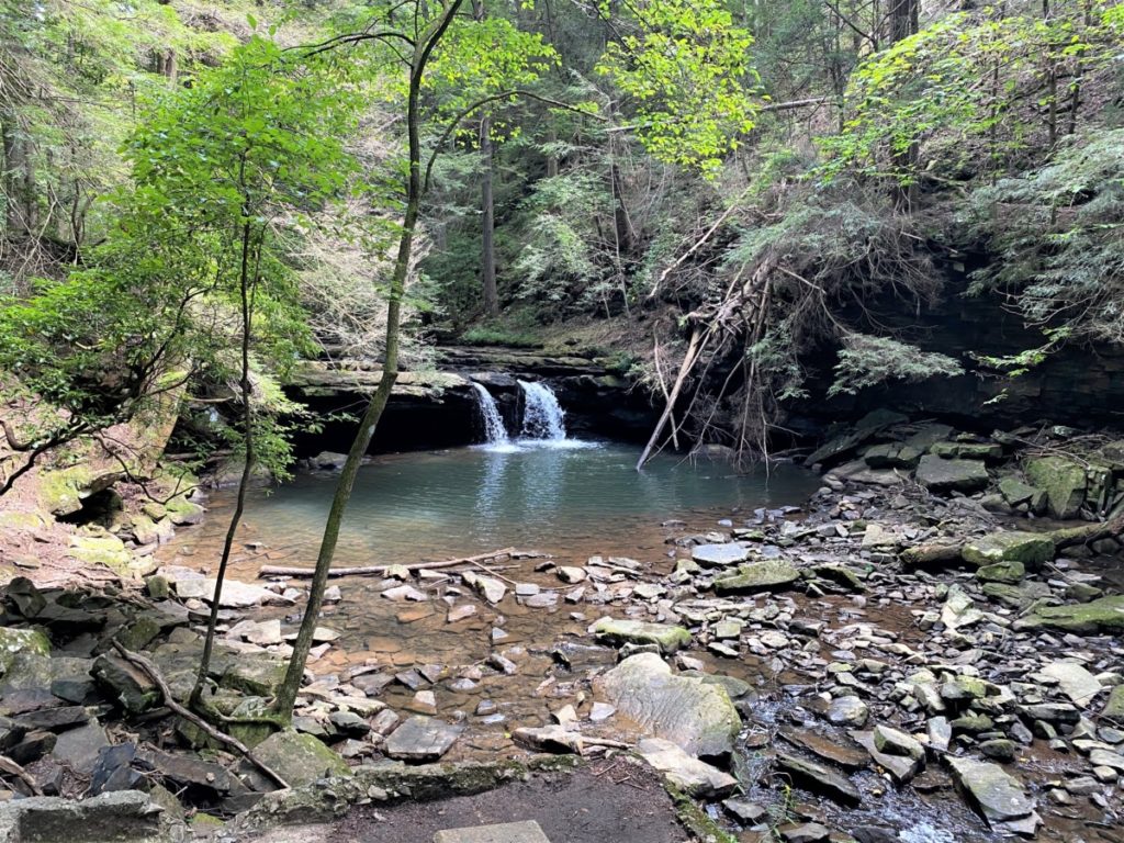 Greeter Falls is a short, 0.5-mile hike that packs a lot of punch. However, short doesn’t mean easy. Rated intermediate, you definitely will have rocky terrain near the waterfalls and it can be slippery after it rains. The trail begins flat and a small 0.2-mile spur trail allowed us to see the Greeter Homestead first. After passing huge cliffs, we began the rocky descent to Lower Greeter Falls. The first view of the falls appears while taking the metal spiral staircase built into the side of the cliff. Although I usually don’t like heights, the stairs didn’t bother me. After another staircase (this time, wooden and straight) the trail ends on the rocky bottom of the canyon. Surrounded by canyon walls, the waterfall refreshed swimmers.
