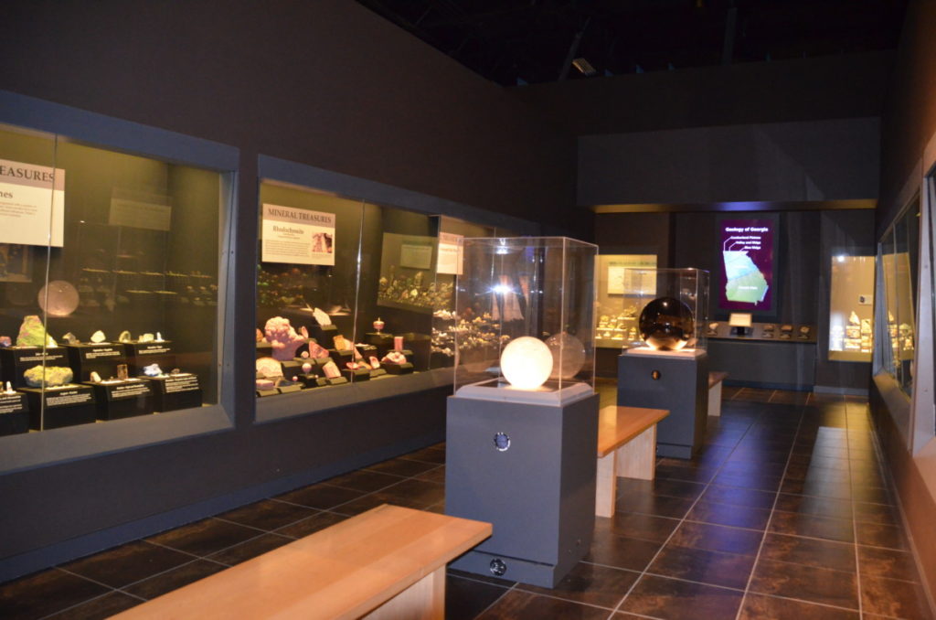 Then it’s on to the different cases. Some feature items from Georgia, including gold, amethyst, barite, and calcite. Another case focuses on southeastern quartz. My favorite display is the birthstones where they have several specimens of each month in different shapes and sizes. It’s interesting to see the difference between the uncut stones found in nature compared to the specimens that are cut, polished and turned into jewelry pieces.