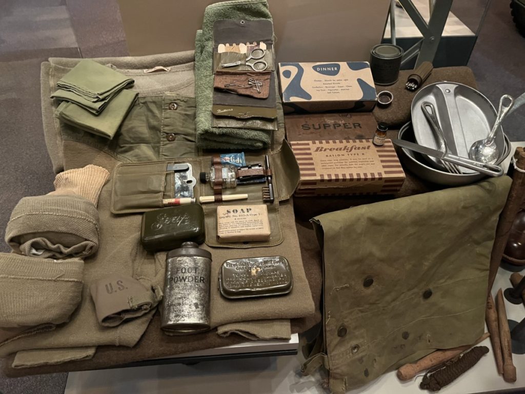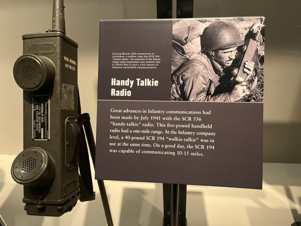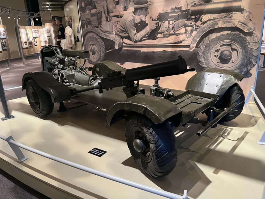 Artifacts included US Army helmets, goggles, and even a field telephone from 1917 connected to string telephone wires. Of particular interest is the “Belly Flopper”. Developed at Fort Benning, the two-man automatic weapons carrier never entered production because it rode too low to the ground, but it served as the basis for the WWII Jeep.