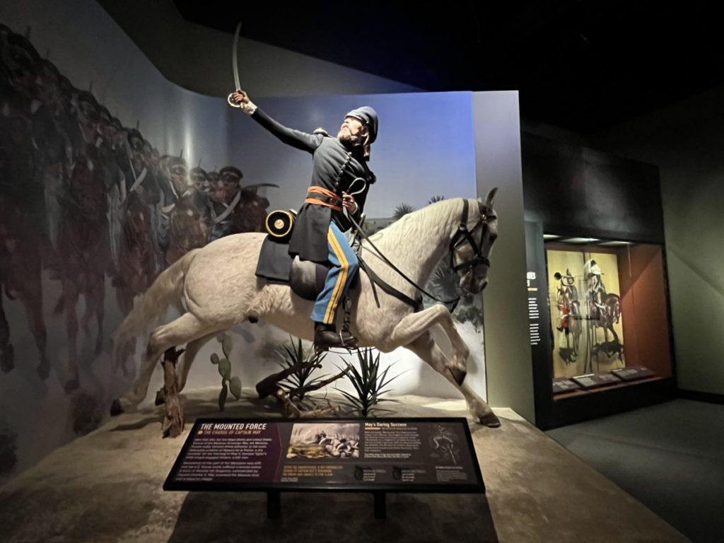 The downstairs houses Eras of Infantry galleries. Securing Our Freedom/Defining Our Nation focuses on the Revolutionary War, Civil War, and Frontier Indian Wars period from 1775-1898. Visitors learn about the importance of drummer boys and bugle calls, as well as how the Minie ball bullet used in the Civil War caused increased casualties due to greater accuracy and range.