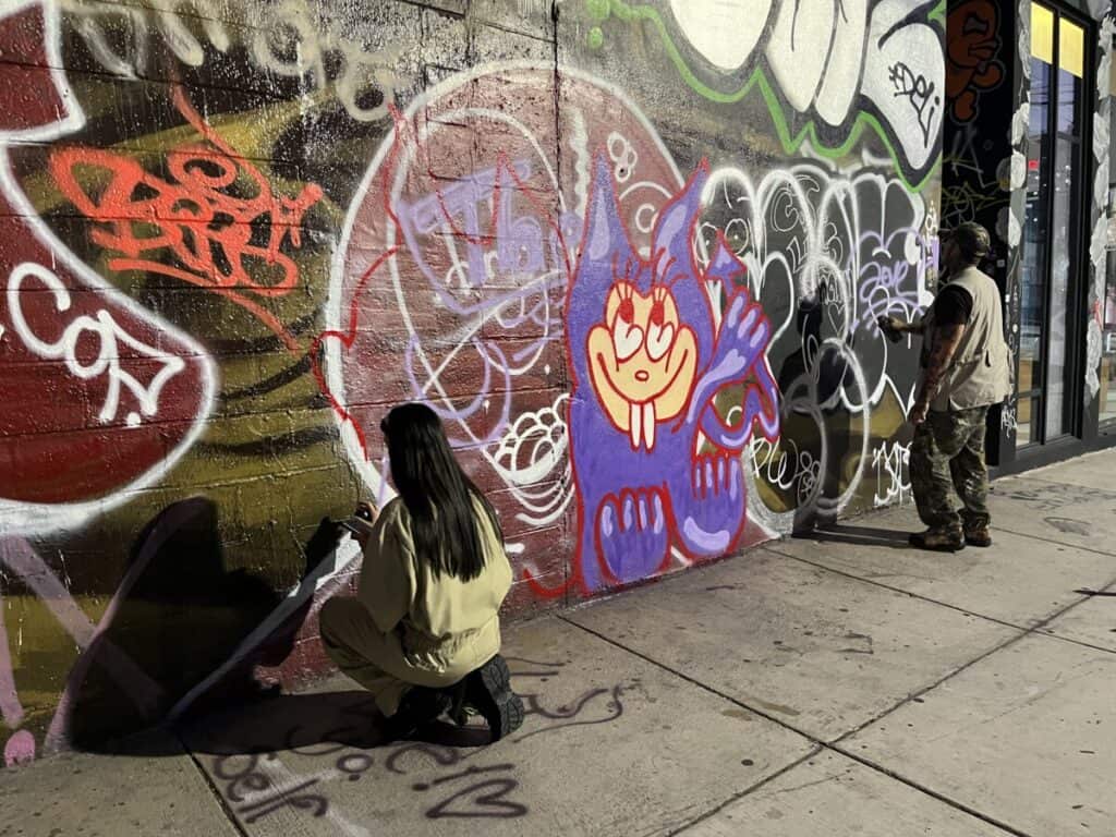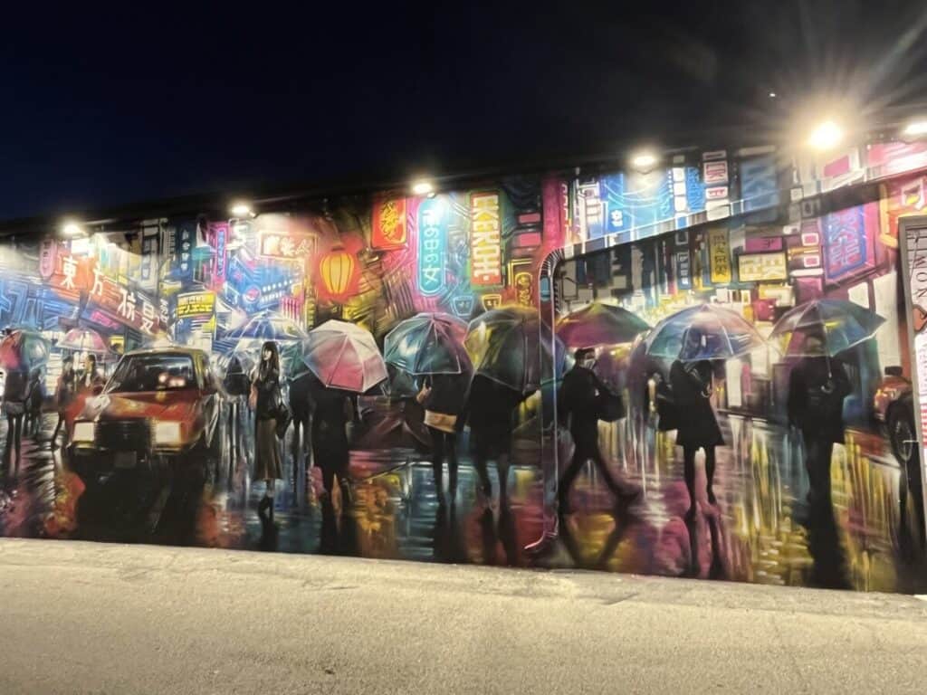 I loved that this pedestrian-only space allowed us to walk up to each mural while not having to worry about looking out for cars. The lighting spotlighted the art and cars couldn’t park on the street and block the view.