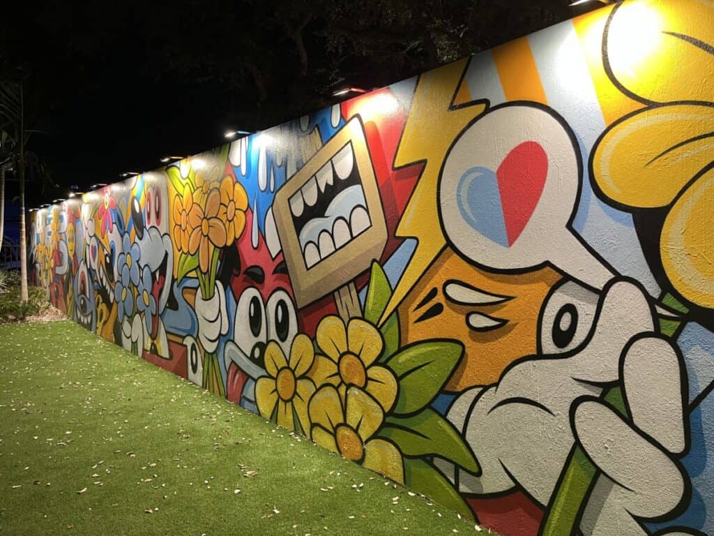 The artists are chosen by Goldman Global Arts, spearheaded by Jessica Goldman Stebnick. Murals Nine new murals were unveiled last November to kick off Miami Art Week. Murals rotate so you might see something different on another visit. During our visit, we viewed murals by Greg Mike, Futura 2000, Dulk, Tomokazu Matsuyama, Kayla May, Dan Kitchener, and others.