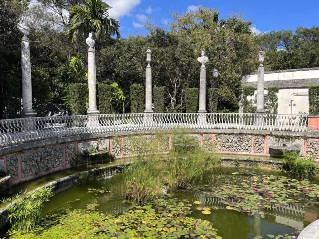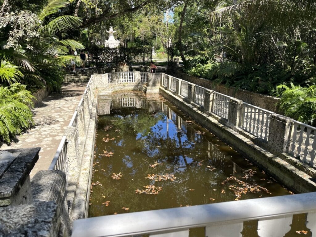 The garden consists of two reflecting pools bisected by a bridge over the canal. The Peacock Bridge features four columns with peacocks carved at the top, flanking both sides of the bridge. Due to the sale of the 130 acres in the 1940s, Vizcaya’s property line stops at the top of this bridge and the peacock columns are undergoing restoration.