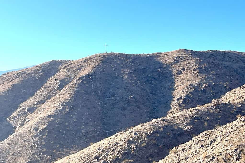 The trail is a moderate, 2.2-mile hike that climbs over 600 feet to a 30-foot-tall Cross. I left the condo around 7:15 am just as the sun was rising. Because all the streets in Palm Desert are laid out in a grid, it was easy to find the area – just south of Fred Waring Drive off of the Pines to Palms Highway. Turning west onto Thrush Ave, I found the parking area at Cap Homme/Ralph Adams Park. It’s basically an unpaved road but plenty of other people had already parked.