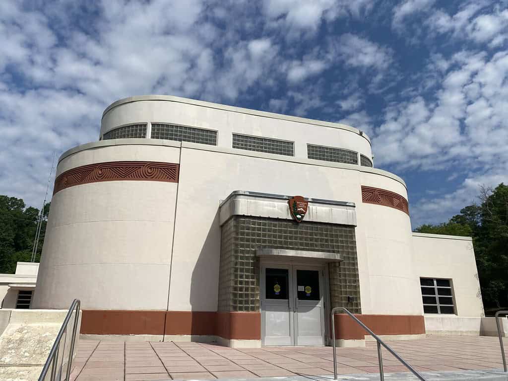 We went inside the Art Deco-style visitor center. Although construction began in 1938, World War II halted the actual completion of the building until 1951. The ranger pointed out the museum behind him, which contains over 2,000 prehistoric artifacts.