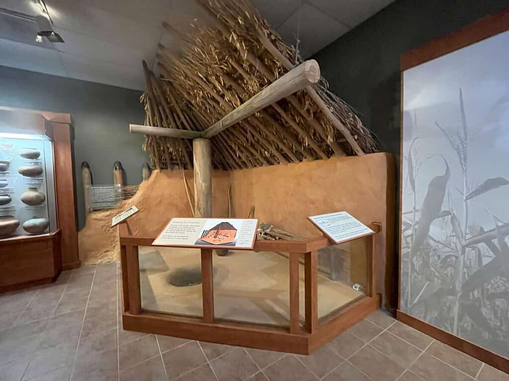 Other exhibits in the museum included pottery found on the site, a diorama depicting the Green Corn Ceremony, and information about Moore’s Raid, in which the British joined forces with the Ocmulgee Muscogee Indians to destroy Spanish Florida villages in 1703. However, the Muscogee turned against the British during the Yamasee War in 1715. At that point, the Muscogee left Ocmulgee to settle closer to the Chattahoochee River.