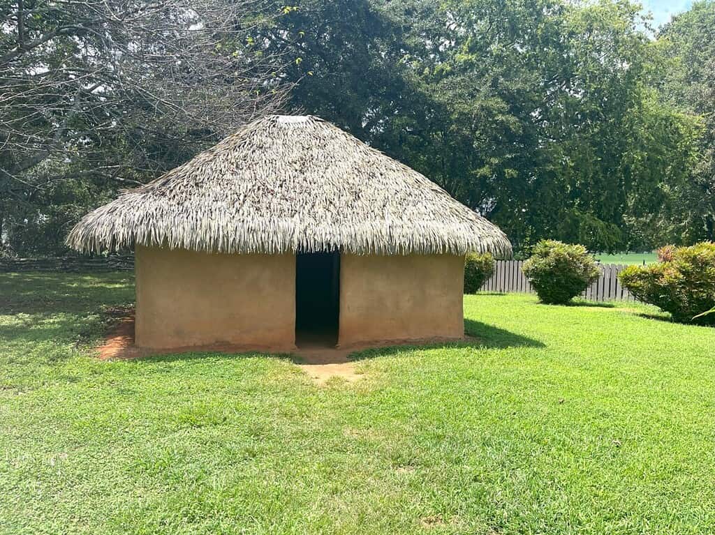 Wattle and daub huts would have surrounded the Plaza. In 2008, volunteers recreated a hut near the museum. They built it with woven wood sticks and branches, “wattle”, and then applied a mixture of red Georgia clay (at least it’s good for something), grass, and water as the glue or “daub” to hold it together.