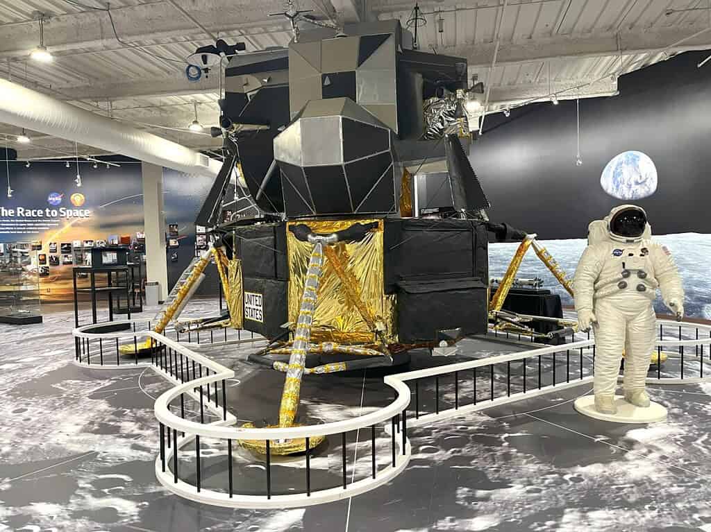 By this time, I was getting overwhelmed, so going into the Space exhibit was a nice change of pace. In the center of the circular room is a 70% scale model of Apollo 11 Lunar Module with an 8-foot-tall astronaut. A timeline introduces visitors to the Space Race between the Americans and Russians, culminating with framed front-page newspapers announcing the moon landing in 1969. On another wall, models of rockets illustrate their significant evolution from the Redstone Rocket launched in 1953 to the much larger and powerful Saturn V, used in the 1970s and 1980s.