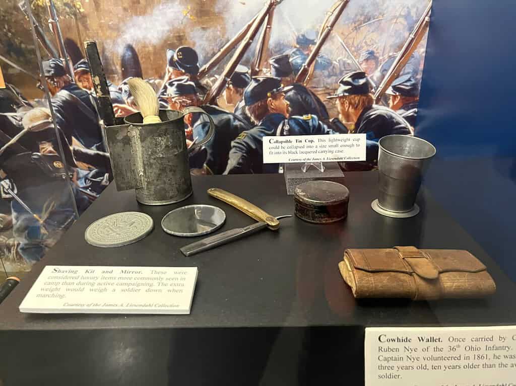 In addition to information regarding the railroads, the museum displays Civil War artifacts, including slave shackles, handguns, rifles, musical instruments used by the army, and even a handwritten letter from Private Summers to his family in Big Shanty (the former name of Kennesaw). Personal effects from soldiers included a wallet, Bible, shaving kit, and playing cards.